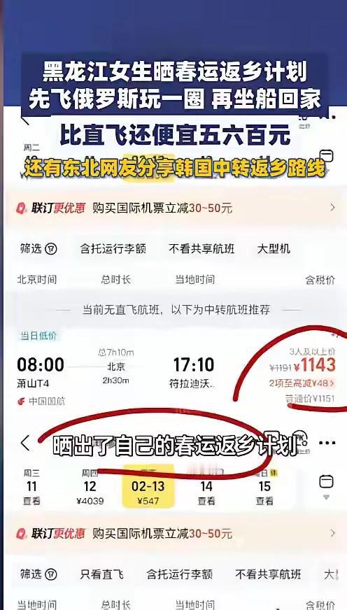 “人怎么能这么聪明!”近日,浙江杭州,一女子买过年回家的机票时,发现要两三千,感觉太贵了,反而飞俄罗斯的却很便宜,于是他竟想出迂回回家的策略,先飞往俄罗斯,再坐船回家,全程算下来,比直飞还便宜五六百元,网友:太有脑子了! 这位黑龙江姑娘小林本来刷机票刷到脑壳疼,杭州飞老家的直飞机票,那价格跟坐火箭似的往上窜,直接干到两三千。正当她对着屏幕唉声叹气时,手滑点进了国际航班页面,眼睛一下就亮了——飞俄罗斯符拉迪沃斯托克的机票才一千出头,比直飞便宜了快一半。 她脑瓜子一转,符拉迪沃斯托克不就在黑龙江边上嘛!从那儿坐个轮渡回国内口岸,再转个车到家,全程算下来居然能省出五六百块。这哪是回家,简直是“反向穷游+极限省钱”的完美结合。 帖子一发出来,东北网友们直接炸锅了,纷纷掏出自己的压箱底攻略。有人说从韩国仁川转机,机票加起来比直飞省了小一千,顺便还能在仁川机场免税店薅点羊毛;还有人试过先飞日本札幌,逛完雪场再坐轮渡回大连,主打一个“回家顺便旅个游”。 评论区里全是人才,有人笑称“这波操作直接把春运玩成了环球影城”,还有人调侃“以后春运抢票得先学世界地理”。 不过乐归乐,这事也透着股子心酸。谁不想舒舒服服直飞回家,躺平睡一觉就到爸妈身边?可看着钱包里的余额,只能硬着头皮研究跨国路线。这哪是“聪明”,分明是打工人被春运票价逼出来的生存智慧。 而且这种“曲线救国”的回家路,风险也不小。签证卡住、航班取消、轮渡遇上大风浪,随便一个意外就能让你在异国他乡原地过年。真要是赶不上年夜饭,省下的那几百块,可能还不够买后悔药的。 说到底,春运的本质就是中国人刻在骨子里的“回家执念”。当团圆的成本高到需要绕道他国,也让我们看到了普通人在现实面前的无奈。 希望未来的春运,能有更多实惠又省心的选择,让大家不用再靠“跨国走位”才能吃上家里的年夜饭。 各位读者你们怎么看?欢迎在评论区讨论。