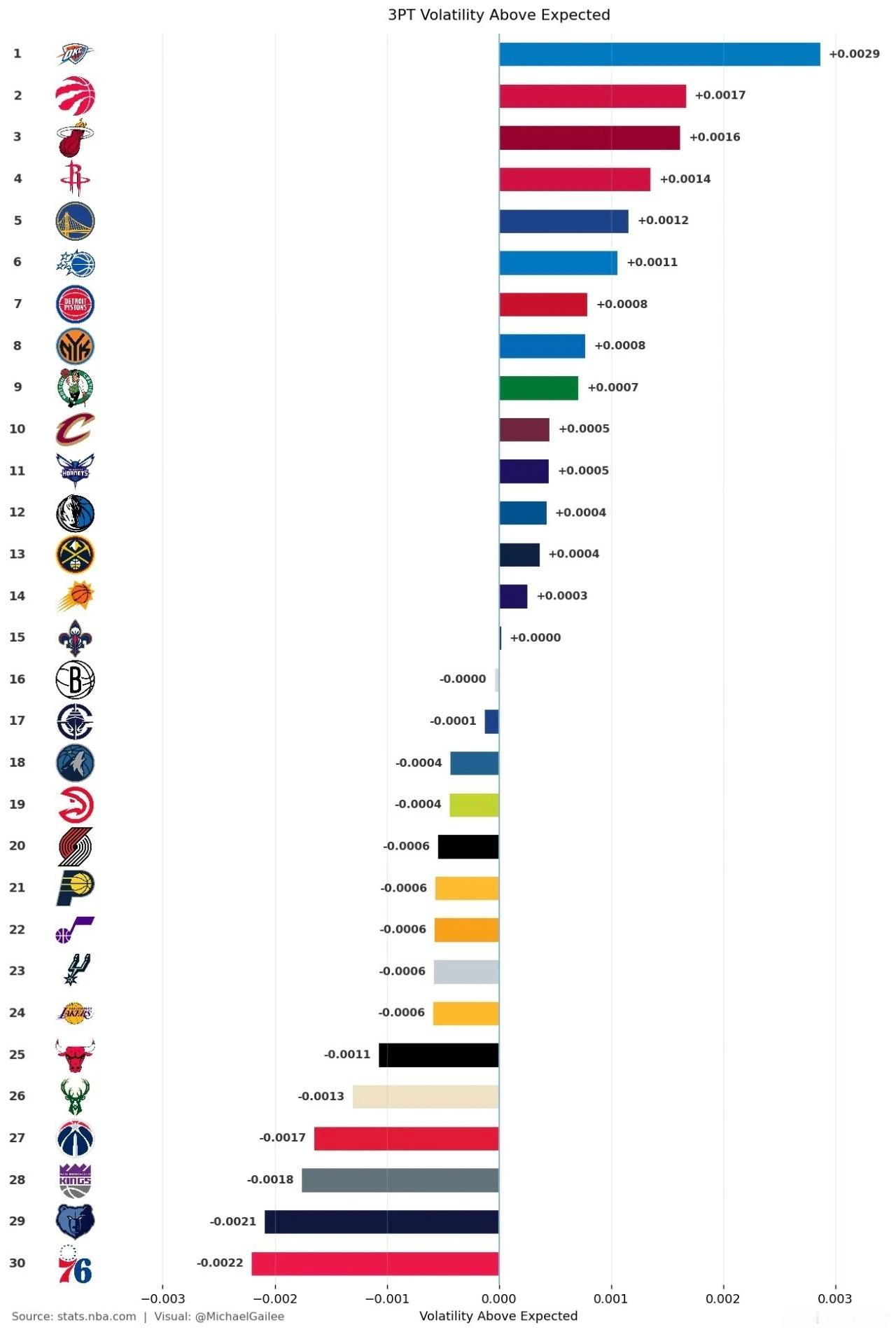 根据博主Gaile分析,雷霆队的三分球表现存在极端的波动性。雷霆队的三分命中率波动幅度(下图纵轴)高居联盟第二,仅次于火箭,横轴则是场均三分出手次数。若排除“出手少自然波动大”的因素(火箭三分出手极少),雷霆的三分波动幅度远超预期,高居联盟第一,且几乎是第二名球队的两倍。尽管赛季三分命中率平均为35.9%,但球迷常感觉球队“要么集体失准(25%),要么集体爆发(45%)”编辑by蓝色狂潮OKC雷霆战胜鹈鹕雷霆vs森林狼雷霆