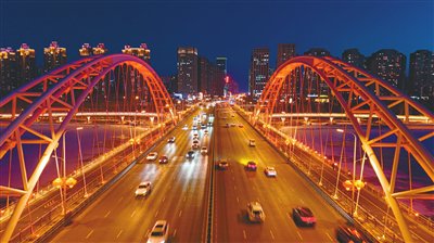1月29日晚,南京桥两侧路灯杆上大红灯笼高高挂,为即将到来的新春佳节增添了喜庆的色彩和氛围。