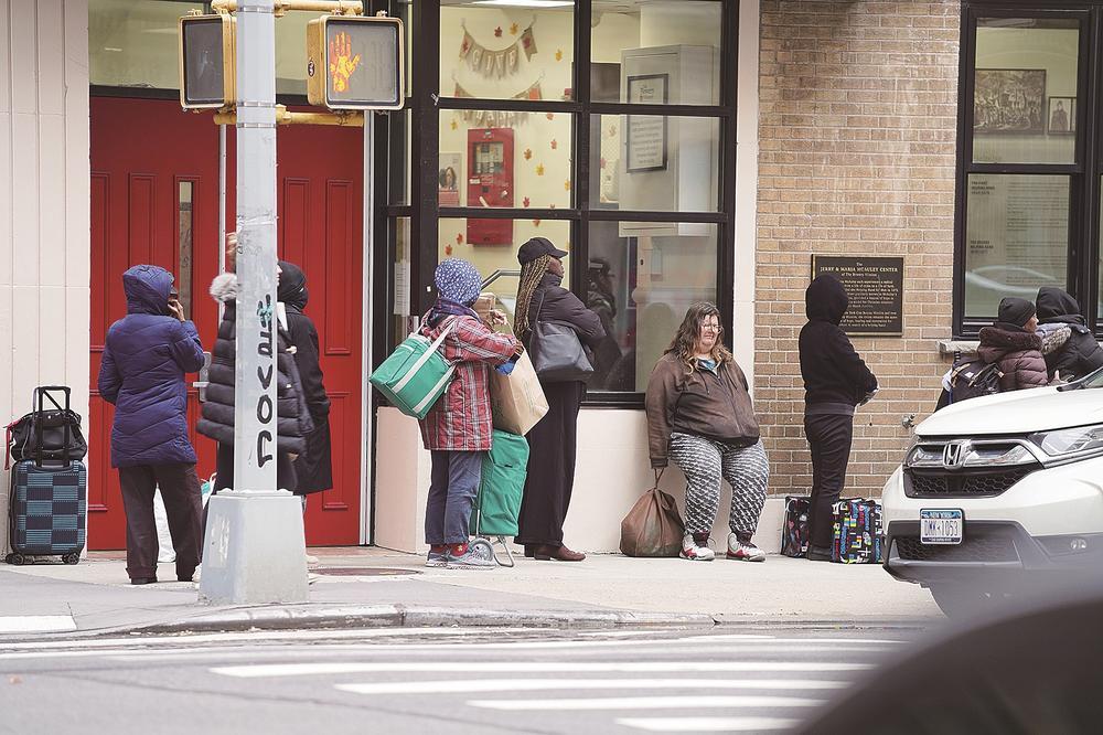 日前,在美国纽约一处无家可归者救助点,人们带着行李排队等待救助。
