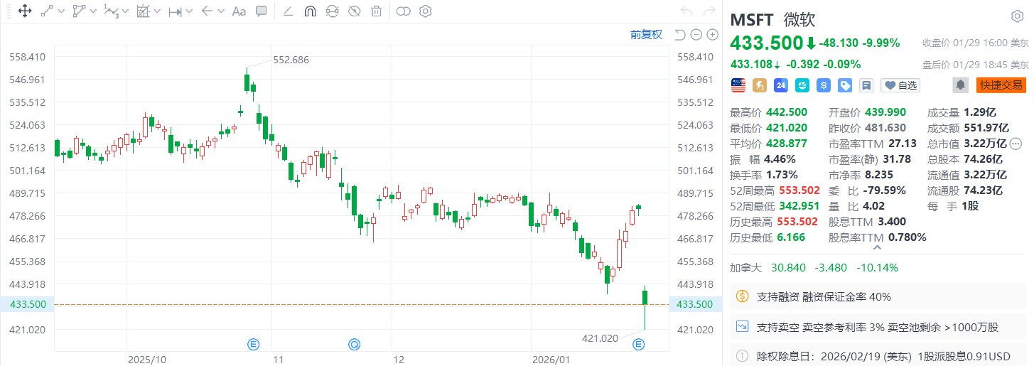 格隆汇1月30日|微软公司股价周四遭遇抛售,跌近10%报433.5美元,市值大减3570亿美元,单日缩水金额在股市史上高居第二。财报显示,微软人工智能(AI)支出创纪录,而核心的云业务部门增长放缓。历史上唯一一次市值单日缩水金额比这更大的,是英伟达去年在DeepSeek推出低成本AI模型后创下的5930亿美元纪录。数据显示,微软市值变动金额超过了逾90%的标普500指数成分股的市值本身。其他一些科技股也感受到了这股寒气。Alphabet和英伟达市值周四均一度蒸发超过1000亿美元。