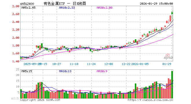 1月29日,有色金属ETF(512400)涨1.80%,成交额60.87亿元。当日份额增加6.67亿份,最新份额为184.61亿份,近20个交易日份额增加77.20亿份。最新资产净值计算值为477.57亿元。