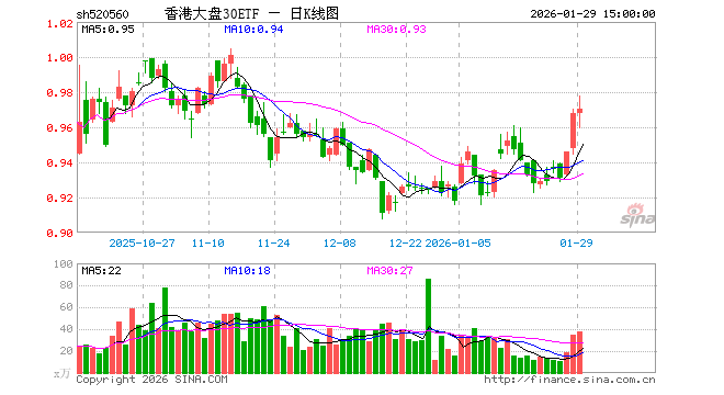 1月29日,香港大盘30ETF(520560)涨0.21%,成交额3722.69万元。当日份额减少400.00万份,最新份额为8.20亿份,近20个交易日份额减少6100.00万份。最新资产净值计算值为8.06亿元。