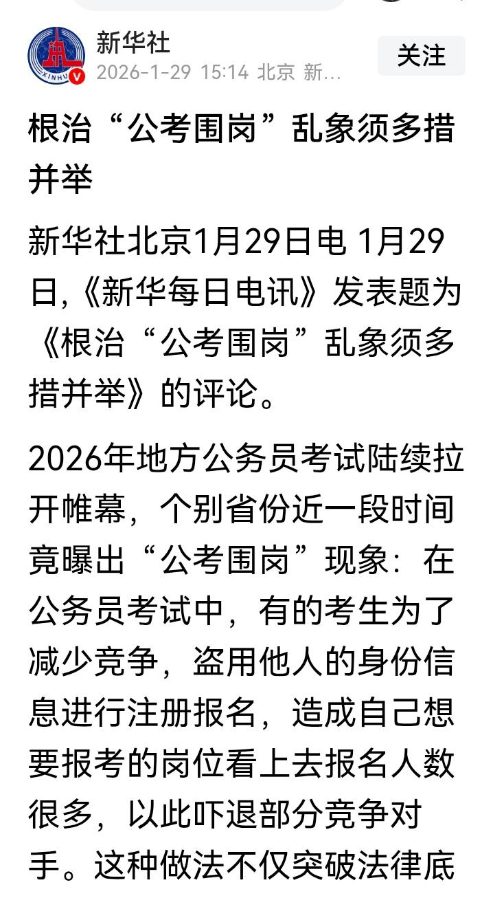 你肯定没听过这个词:“公考围岗”!这是今年公务员招考时诞生的一个新词(详见附图)! 听说过围城、围炉、围观,如今考公竟玩出了“围岗”新战术——有人盗用他人身份疯狂注册报名,把自己想报的岗位刷成“千人竞聘”的火爆假象,吓得竞争对手鼠标一抖直接撤退。 这波操作,比打麻将时偷偷多抓牌,试图吓唬对手“我快停牌了你们放弃吧”。 更讽刺的是,这些“战术大师”可能没想过:公务员选拔要的是为人民服务的真心实意,不是玩“狼人杀”的心理战。 笔试面试层层关卡,最终靠的是真才实学,不是报名页面的虚拟人数。玩这种小聪明,就像考试前偷偷擦掉黑板上的知识点——除了暴露自己心虚,还能吓到谁? 有网友锐评:“这算盘打得,我在海南都听见了。” 其实真正该打的算盘是:把琢磨歪点子的时间用来刷题,早上岸了。 现在问题来了—— 如果你发现心仪岗位报名人数一夜暴涨,你会选择: A. 果断撤退另寻他岗 B. 怀疑有诈坚持报考 C. 反手一个举报 D. 留言区说出你的神操作公考陷阱 公考误区