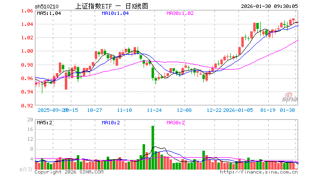 1月30日,上证指数ETF(510210)开盘跌0.57%,报1.041元。上证指数ETF(510210)重仓股方面,农业银行开盘涨0.00%,中国石油涨0.37%,贵州茅台跌0.19%,工业富联跌1.04%,中国银行涨0.19%,紫金矿业跌5.18%,中国神华跌0.02%,中国人寿跌0.42%,招商银行涨0.00%,中国平安涨0.01%。