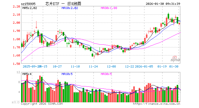 1月30日,芯片ETF(159995)开盘跌0.55%,报1.974元。芯片ETF(159995)重仓股方面,中芯国际开盘跌0.87%,海光信息涨0.00%,寒武纪跌0.00%,北方华创跌0.62%,兆易创新涨2.44%,中微公司跌0.55%,澜起科技跌1.05%,豪威集团跌0.30%,拓荆科技跌0.76%,长电科技跌0.06%。