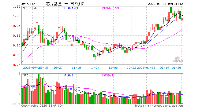 1月30日,芯片ETF广发(159801)开盘跌0.91%,报0.976元。芯片ETF广发(159801)重仓股方面,中芯国际开盘跌0.87%,海光信息涨0.00%,寒武纪跌0.00%,北方华创跌0.62%,兆易创新涨2.44%,中微公司跌0.55%,澜起科技跌1.05%,豪威集团跌0.30%,拓荆科技跌0.76%,长电科技跌0.06%。