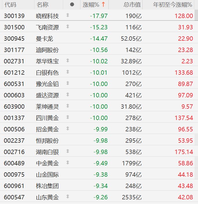 A股异动丨金银价闪崩,黄金概念股集体下挫,白银有色、四川黄金等多股跌停