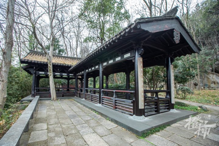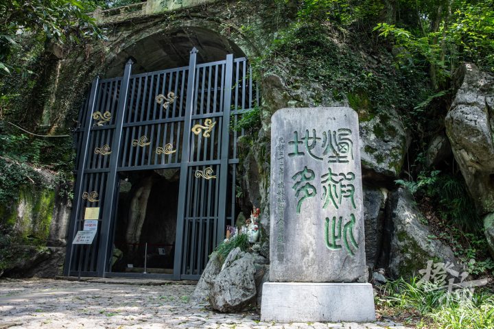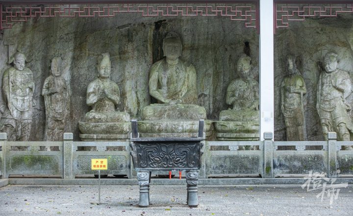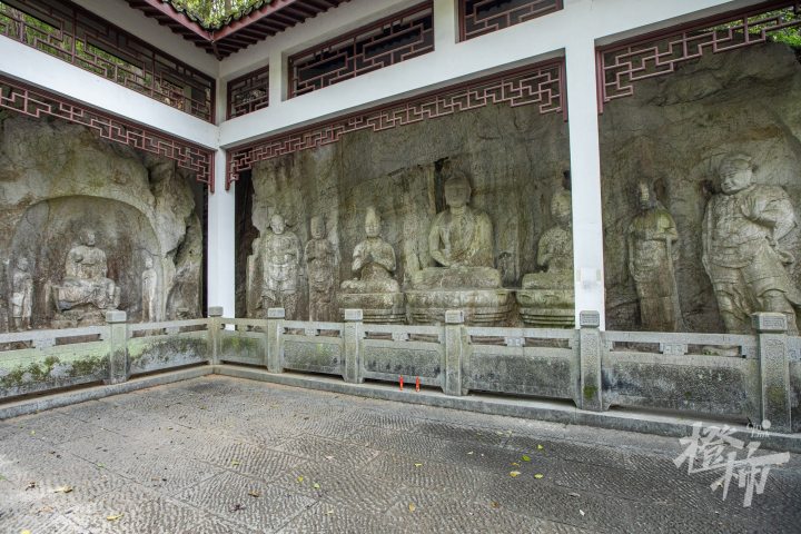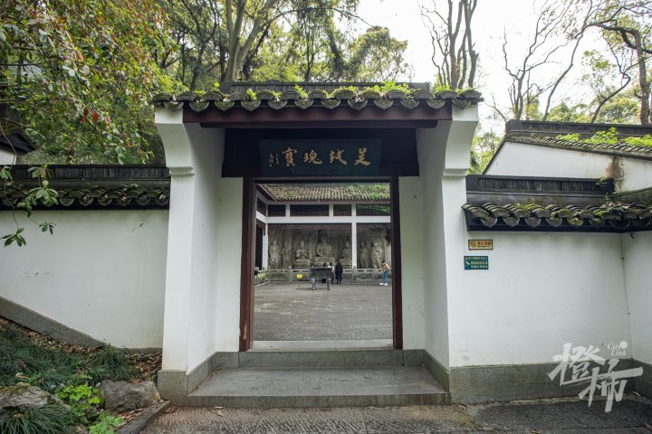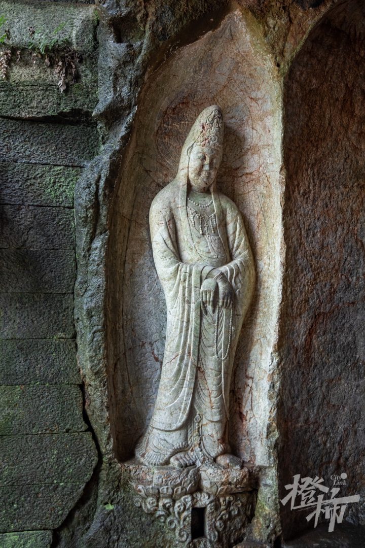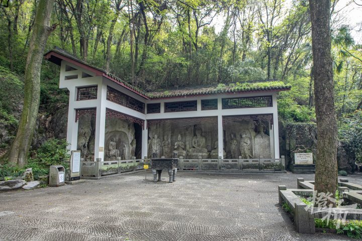顺着慈云岭古道一路往南,路分两条,一条往上去到玉皇山顶,一条往下通五代摩崖石刻。走过老玉皇宫门口,拾级而下,大概走十来米,能看到一个环境清幽的小院落,门前匾额上写“吴越瑰宝”四个大字。岭南山坡上有五代时期的石窟造像,共两龛七尊,这是目前西湖景区保存较为完整的石刻造像。后晋天福七年(942年),即位不久的第三代吴越国王钱弘佐,为护佑国家,在慈云岭上创建了镇国资延禅院。院内开凿巨大的石窟造像,并以石窟22造像为主龛建造大殿,成为吴越国罕见的石佛殿。资延禅院造像是中国现存为数不多的敕建石窟造像。2006年,慈云岭造像与烟霞洞造像、天龙寺造像,共同组成“西湖南山造像”,被列为全国重点文物保护单位。