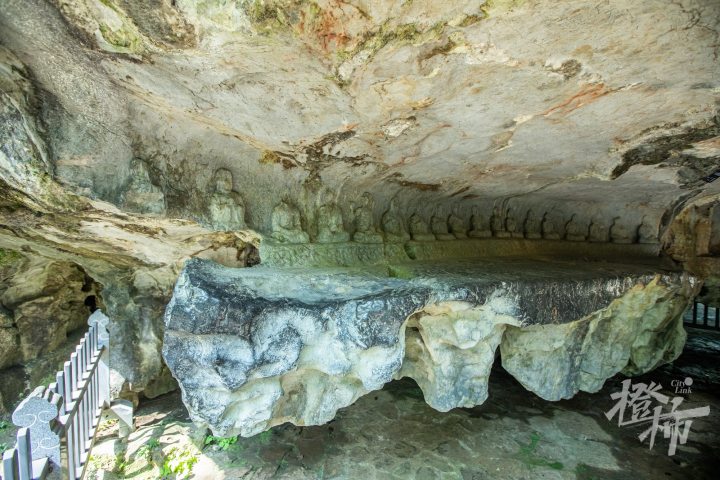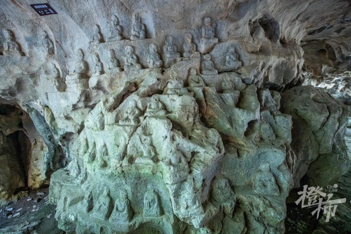 沿山路来到这里,最先遇到的是洞口一尊单立的观音菩萨造像。洞内则是一组七尊造像,包括“一佛二弟子二菩萨二天王”。这组造像对面的石灰岩山体上,有一块长方形的磨光幅面,上面原本是有刻字的,但因年代久远,字迹已经风化难以辨别。根据专家判断,这面石壁刻的是《观弥勒菩萨上生兜率天经》,是目前仅存的五代吴越国天然崖壁摩崖刻经原物,与洞窟造像一起出现,这种佛像配经文的刻法,在东南地区尚属首例,弥足珍贵。