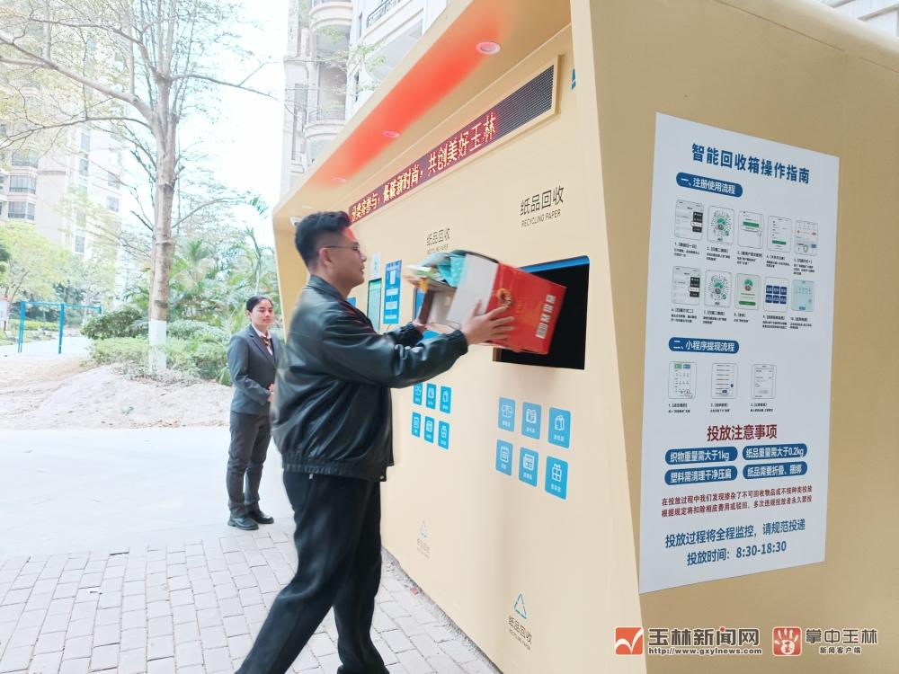 玉林新闻网-玉林日报讯(记者唐劲梅)近期,在玉林不少居民小区及高校等地出现了一款新型的智能回收箱,相比以往的废旧物回收箱,它不仅容量更大、分类更细,而且还融入了自动识别、自动称重、自主回收、即刻结算等智能功能,成为自成一体的旧废品智能回收站,受到不少市民的欢迎。