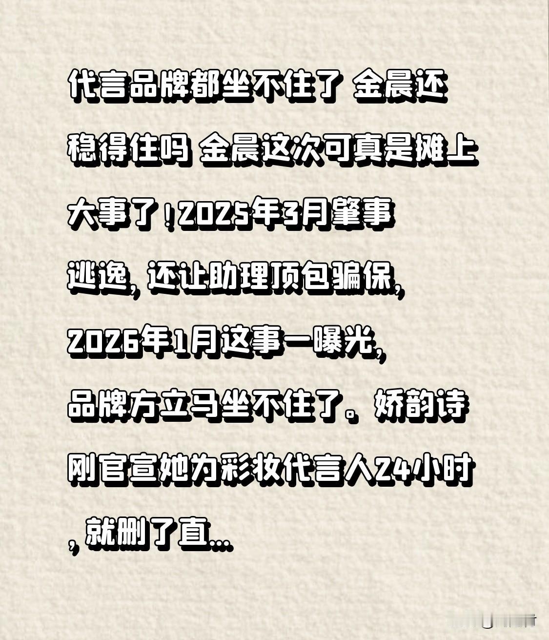 代言品牌都坐不住了 金晨还稳得住吗 代言品牌都坐不住了,金晨还能稳得住吗?金晨这次可真是惹上大麻烦了!2025年3月,她肇事逃逸,还让助理顶包骗保。2026年1月,此事一经曝光,品牌方立刻坐不住了。娇韵诗刚官宣她为彩妆代言人24小时,就删了直播预告,客服称暂无合作计划。喜之郎也迅速删光“金晨同款”。 明星代言合同都有道德条款,若肇事逃逸等行为坐实,品牌可解约追责。金晨手握十多个代言,违约金数额巨大。 再看她过往,模仿卡塔尔小王子表情包遭骂,上节目拉踩他人,感情方面还说谎。她一直冷处理并非良策,越沉默质疑声越大,不少代言估计都悬了,她还能稳得住吗?
