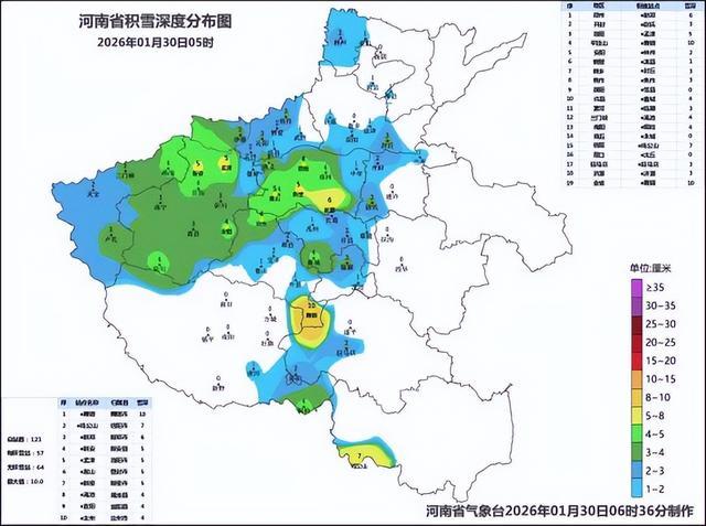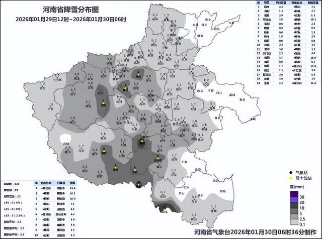 1月30日,记者从河南省气象局了解到,省气象台监测显示,1月29日12时至30日7时,我省大部出现小到中雪,局部大到暴雪,南部出现雨或雨夹雪转雪,嵩山、鸡公山出现冻雨。全省平均降雪量2.2毫米,地市平均降雪量位列前三的分别为:郑州4.2毫米、洛阳4.0毫米、平顶山3.8毫米,降雪量位列前三位的分别为:鸡公山11.6毫米、舞钢10.1毫米、桐柏10.0毫米。降水量位列前三位的分别为:息县16.3毫米、新县16.0毫米、光山14.6毫米。截至30日5时,我省中西部、西北部、南部有3到7厘米积雪,其中平顶山局部10厘米。
