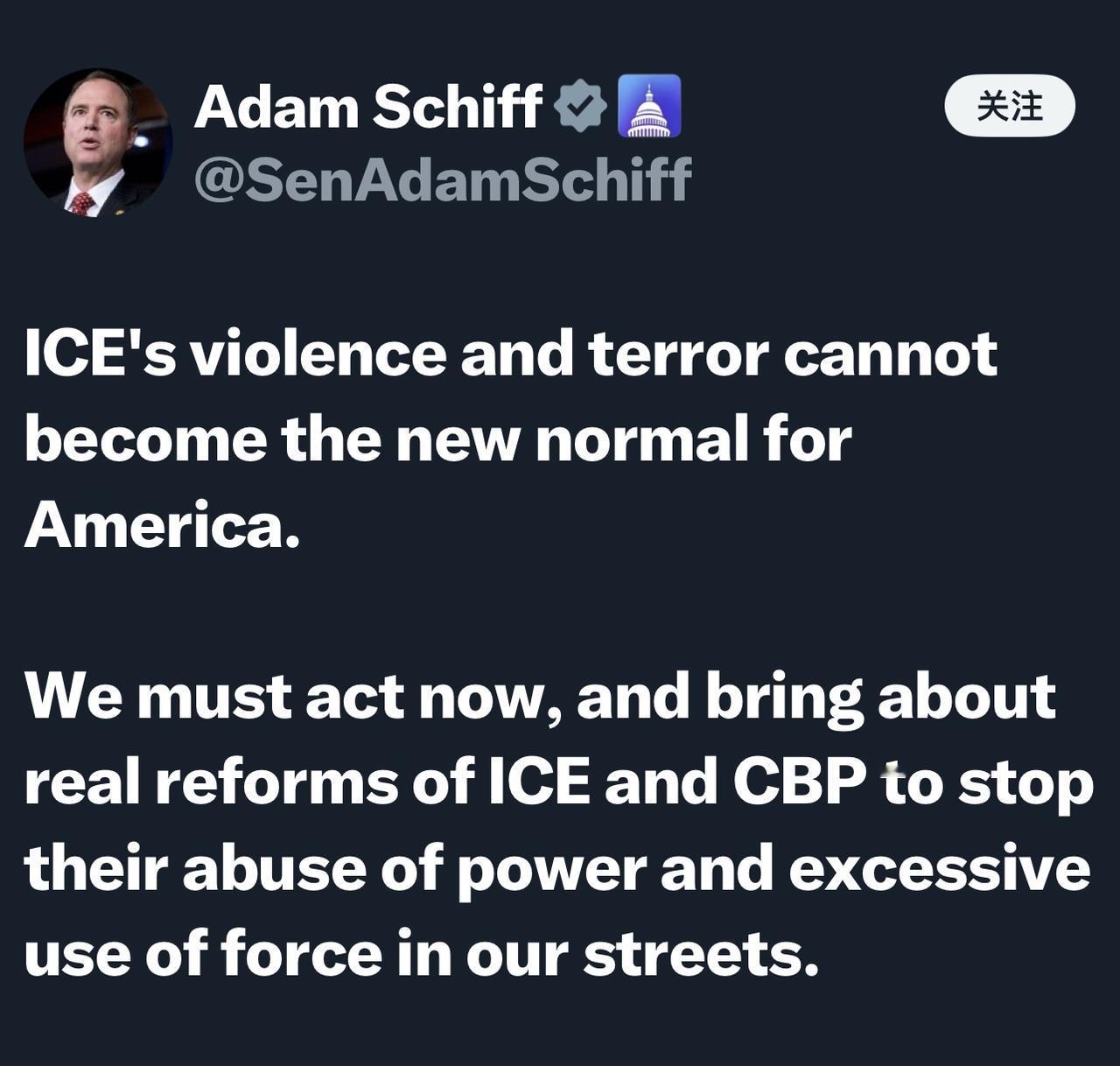 美国国会加州参议员亚当.希夫: “美国移民及海关执法局(ICE)的暴力和恐怖行径绝不能成为美国的新常态。 我们必须立即采取行动,对美国移民及海关执法局 (ICE) 和美国海关与边境保护局 (CBP) 进行真正的改革,以制止他们滥用权力和在我们的街道上过度使用武力。”