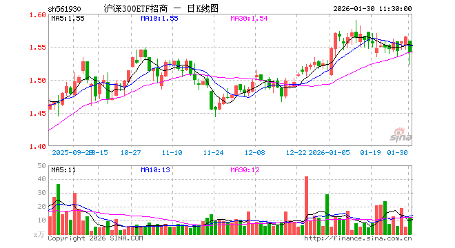 1月30日,截止午间收盘,沪深300ETF招商(561930)跌1.53%,报1.541元,成交额1906.87万元。沪深300ETF招商(561930)重仓股方面,宁德时代截止午盘涨2.93%,贵州茅台跌2.18%,中国平安跌1.81%,中际旭创涨4.07%,紫金矿业跌8.33%,招商银行涨0.65%,新易盛涨4.40%,美的集团涨0.95%,兴业银行跌0.21%,寒武纪涨1.35%。