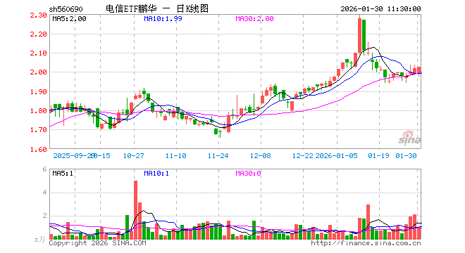 1月30日,截止午间收盘,电信ETF鹏华(560690)涨0.35%,报2.023元,成交额200.34万元。电信ETF鹏华(560690)重仓股方面,中国移动截止午盘跌0.33%,中国联通跌0.78%,中国电信涨1.01%,中国卫通涨1.14%,中际旭创涨4.07%,银之杰跌3.41%,新易盛涨4.40%,中兴通讯跌1.75%,天孚通信涨11.92%,中天科技涨5.17%。