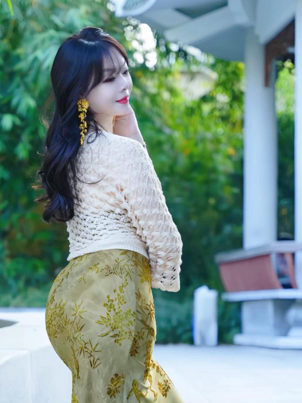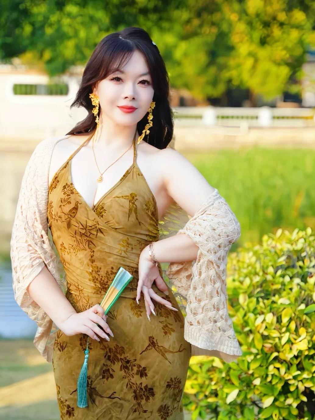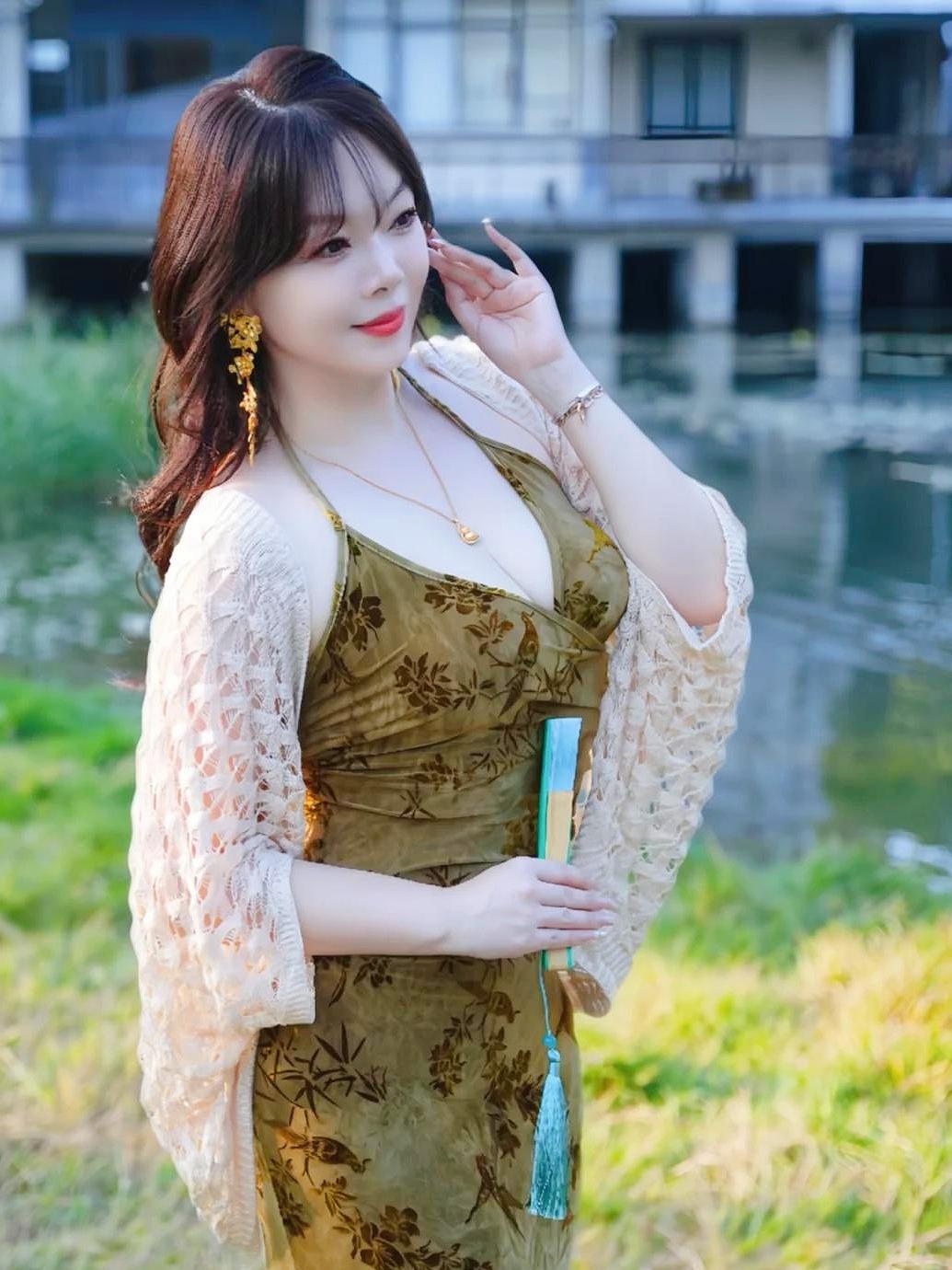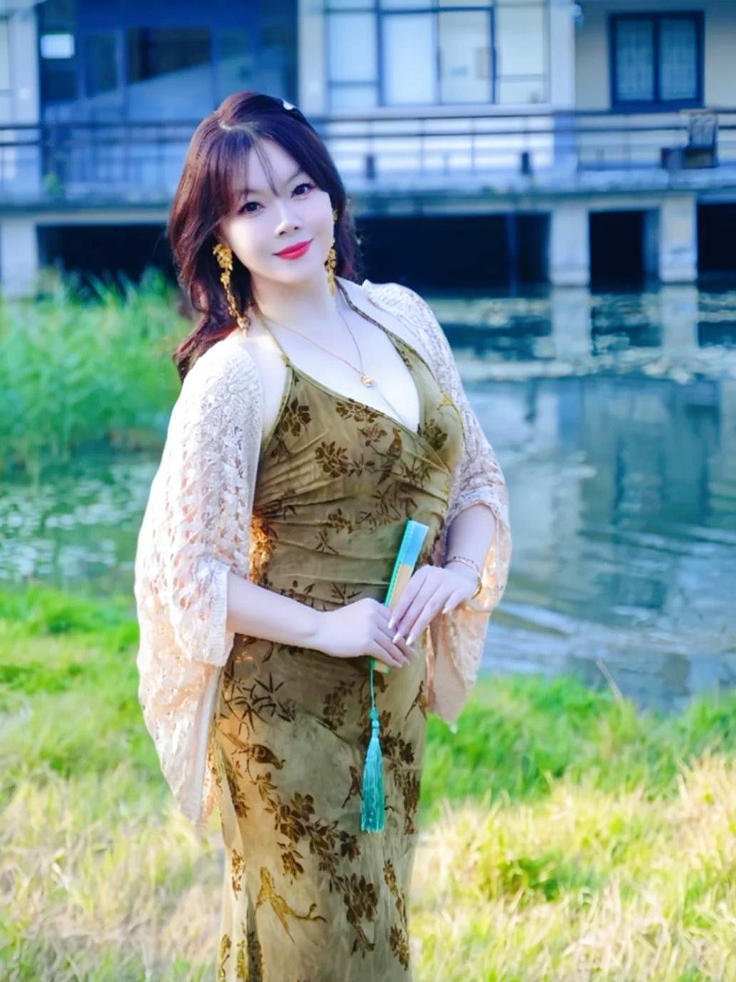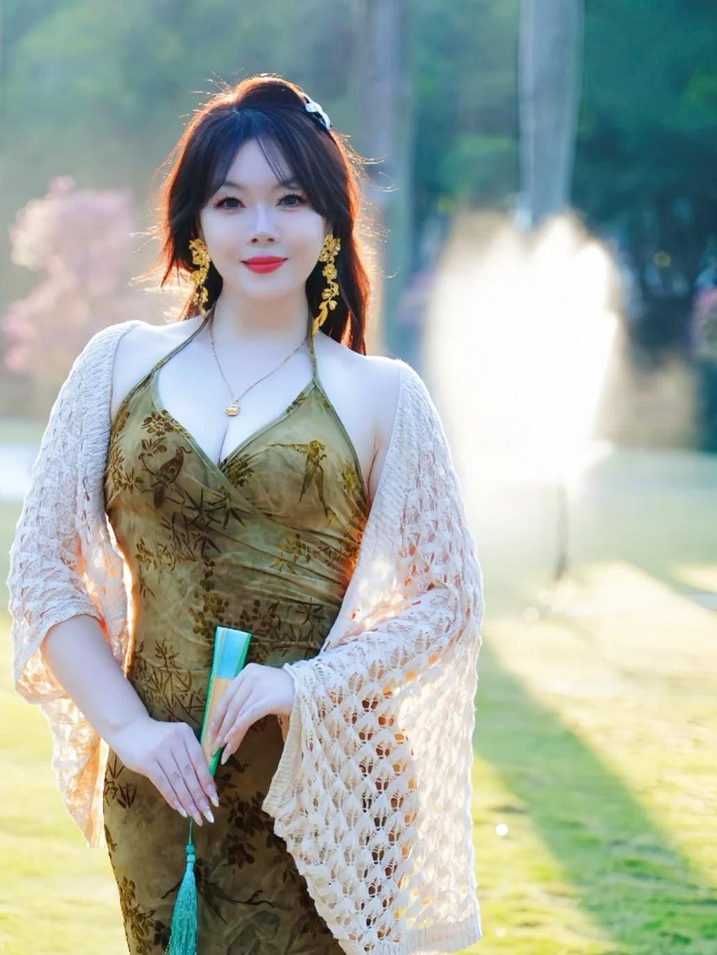 《苔绿罗裙》 苔绿罗裙覆软纱,香风拂袖胜桃花。 手持轻扇凝春态,立向溪桥沐晚霞。 翠影摇波人欲醉,金垂耳珮鬓斜斜。 晴光漫染娇容暖,一径芳尘衬丽华。 原创诗词