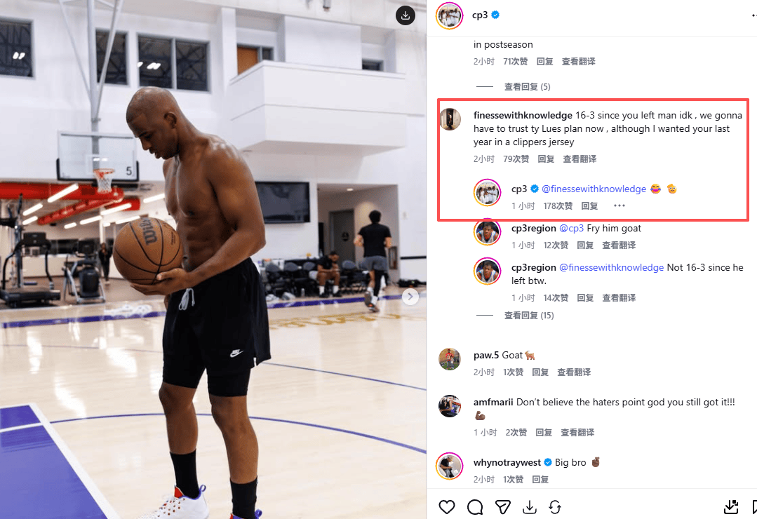 虎扑01月30日讯前快船球员克里斯-保罗今日更新INS动态,随后在评论区和网友互动。