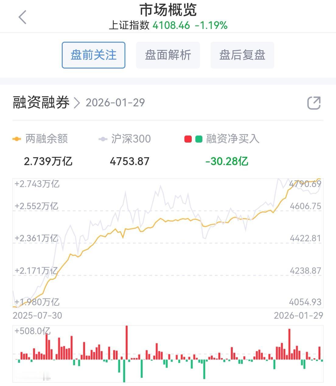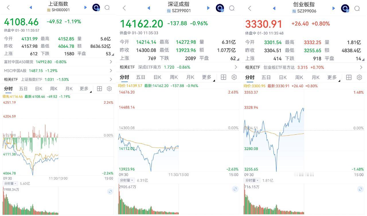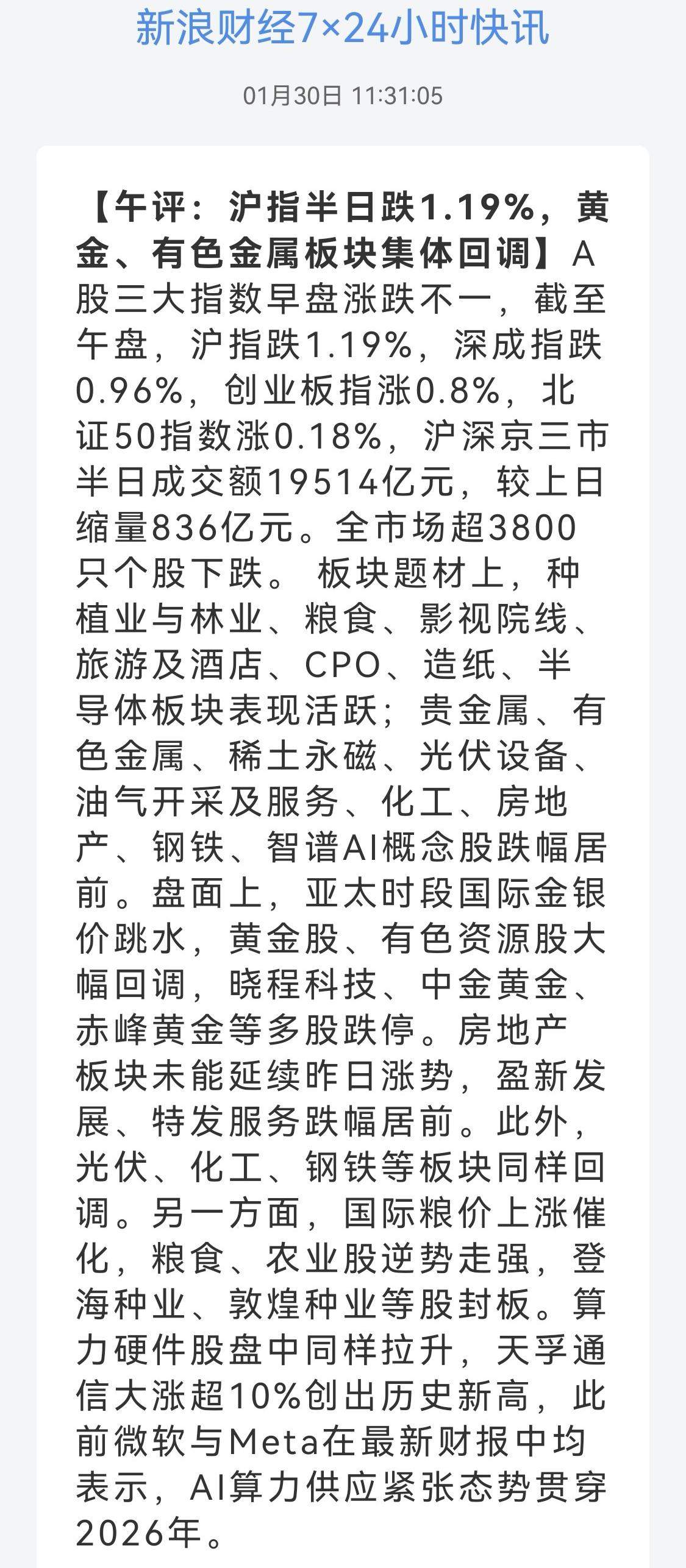 午盘印象(1月30日) 调控消失 指数跳水回升 外围:美股红绿 跳水又回升 影响一般 内股:大宗商品跳水 个股弱势 AI硬件护盘 一、三大股指开跌: 指数弱势 个股开盘涨平跌比率20%:10%:70%。 个股开盘极弱势(-49 Vs -44个百分点), 弱于上个交易日, 二、指数分化 深强沪弱 大宗商品暴跌,个股受压谨慎 半日1.93万亿,量能稍萎缩 三、涨跌幅榜: 科技回暖,红利震荡 跌幅前列:有色贵金属、地产产业链、 涨幅前列:AI硬件、旅游餐饮、IP经济 四、开盘和午盘: 开盘:沪-0.63%、深-0.60%、创-0.09%。 午盘:沪-1.19%、深-0.96%、创+0.80%。 大宗压制上证 深小创V起,ETF痕迹不见 五、午盘个股上涨27%,与昨日涨跌差距(-44 Vs -7个百分点),个股大幅回暖 相比开盘,跌涨差稍减,上涨个股略增 净流入-916 (-432)亿,大幅流出又恶化 六、沪深两市成交量午盘19,329亿,上个交易日20,165亿,同比量能萎缩超800亿,探底稍回升,指数分化。 七、指数自我调整,量能萎缩 融资额前日大幅增加+193亿,盘中调控升级,昨日净减少-30亿。大宗商品压制上证深成指 午后两种情形: 1、横盘震荡:大宗商品大幅波动,难以短期减轻,时间换空间,震荡消化获利盘。 2、震荡回升:受压已久上行迫切,慢牛格局未变。 (图片源自网络侵权告知删除)
