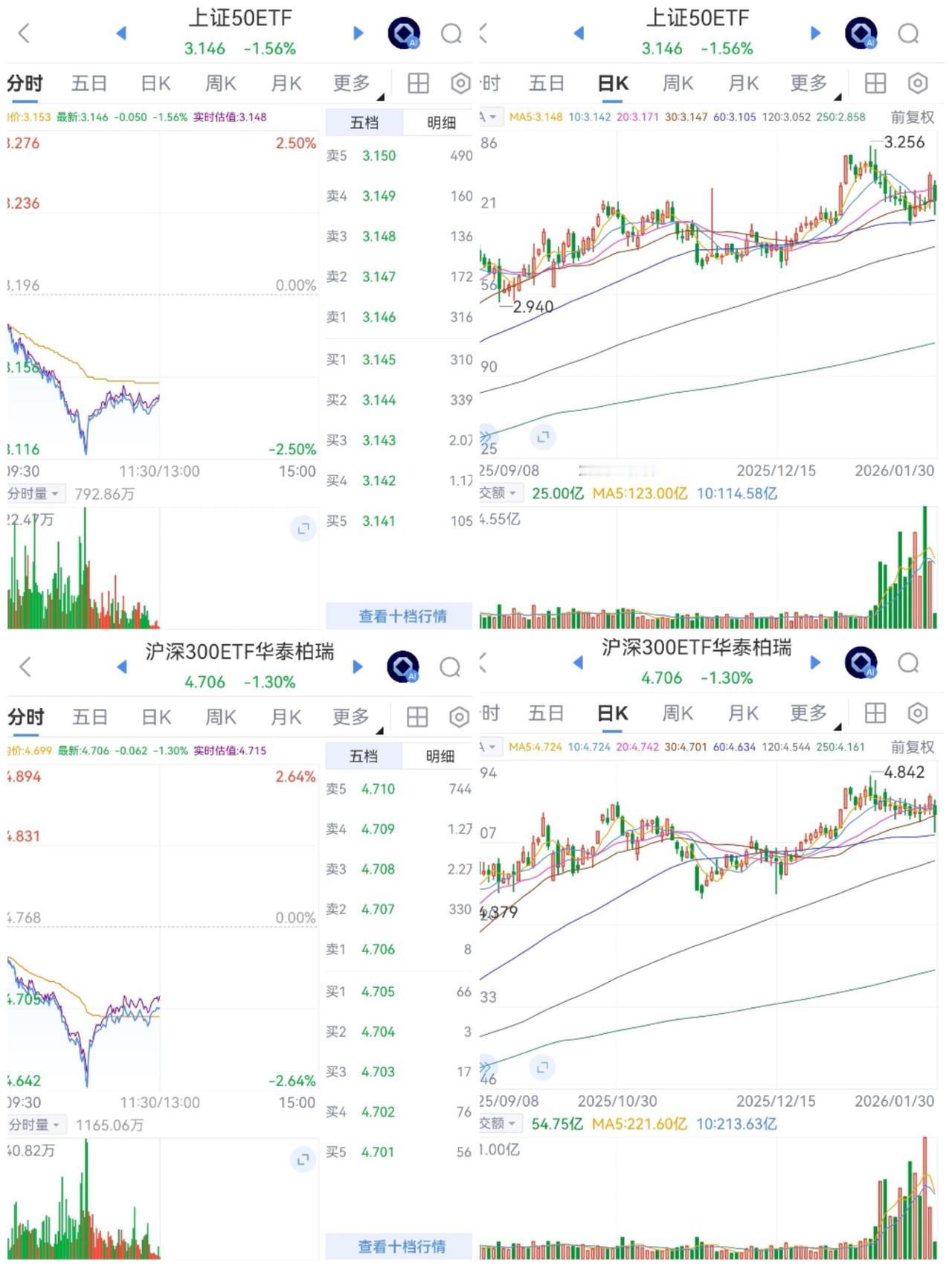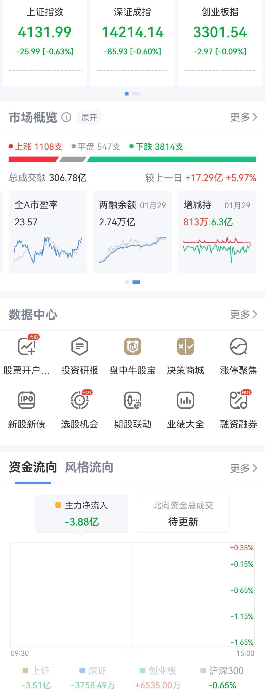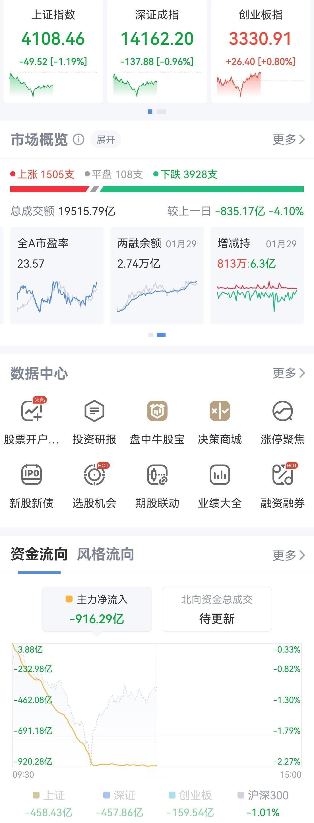 午盘印象(1月30日) 调控消失 指数跳水回升 外围:美股红绿 跳水又回升 影响一般 内股:大宗商品跳水 个股弱势 AI硬件护盘 一、三大股指开跌: 指数弱势 个股开盘涨平跌比率20%:10%:70%。 个股开盘极弱势(-49 Vs -44个百分点), 弱于上个交易日, 二、指数分化 深强沪弱 大宗商品暴跌,个股受压谨慎 半日1.93万亿,量能稍萎缩 三、涨跌幅榜: 科技回暖,红利震荡 跌幅前列:有色贵金属、地产产业链、 涨幅前列:AI硬件、旅游餐饮、IP经济 四、开盘和午盘: 开盘:沪-0.63%、深-0.60%、创-0.09%。 午盘:沪-1.19%、深-0.96%、创+0.80%。 大宗压制上证 深小创V起,ETF痕迹不见 五、午盘个股上涨27%,与昨日涨跌差距(-44 Vs -7个百分点),个股大幅回暖 相比开盘,跌涨差稍减,上涨个股略增 净流入-916 (-432)亿,大幅流出又恶化 六、沪深两市成交量午盘19,329亿,上个交易日20,165亿,同比量能萎缩超800亿,探底稍回升,指数分化。 七、指数自我调整,量能萎缩 融资额前日大幅增加+193亿,盘中调控升级,昨日净减少-30亿。大宗商品压制上证深成指 午后两种情形: 1、横盘震荡:大宗商品大幅波动,难以短期减轻,时间换空间,震荡消化获利盘。 2、震荡回升:受压已久上行迫切,慢牛格局未变。 (图片源自网络侵权告知删除)