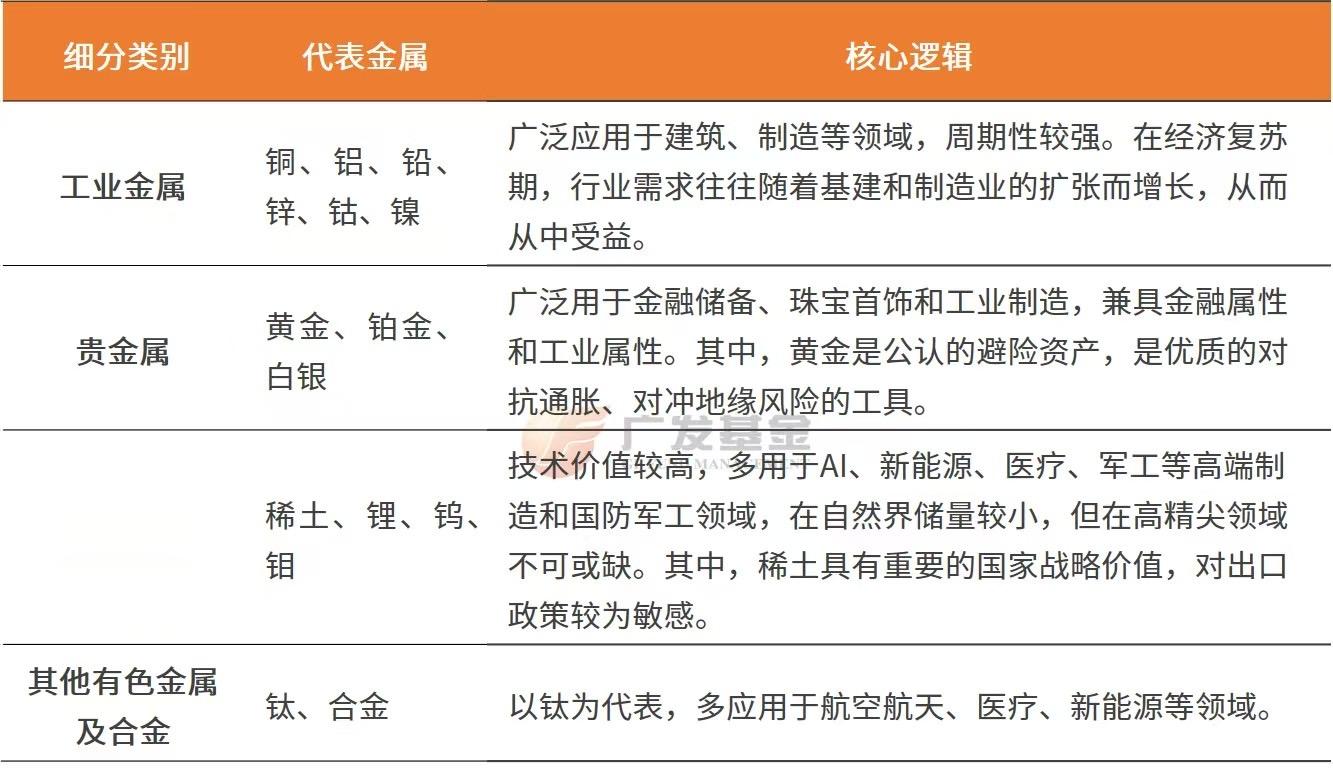 根据中证行业分类标准,有色金属属于二级行业,可以进一步分为4个三级行业,各有不同的代表金属和投资逻辑,投资者可以通过下方表格来快速了解它们的特征。