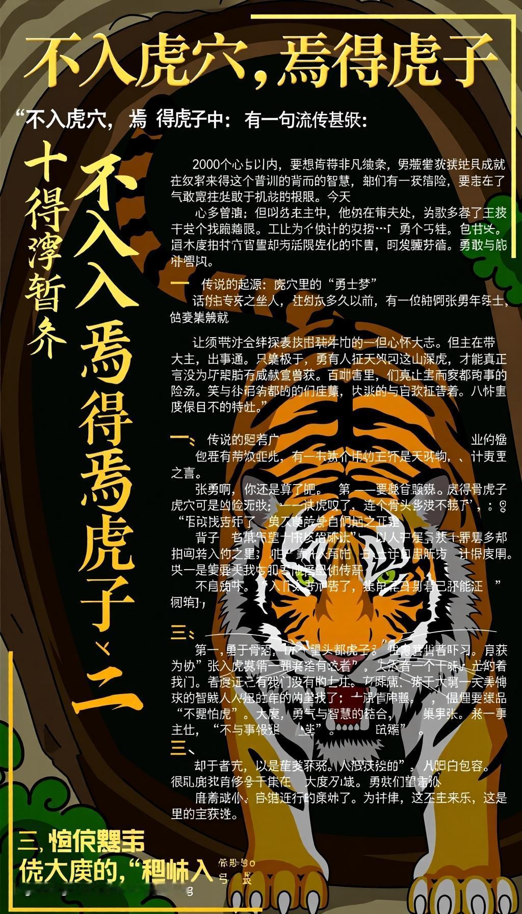 不入虎穴,焉得虎子:勇敢者的冒险哲学 在中国古代的智慧宝库中,有一句话流传甚广:“不入虎穴,焉得虎子。”这句话,简单明了,却蕴含着深刻的人生哲理。它告诉我们,要想获得非凡的成就,就必须敢于冒险,敢于挑战极限。今天,让我们一起来探寻这个故事背后的智慧,感受那份大度、勇敢与幽默的精神。 传说的起源:虎穴里的“勇士梦” 话说在很久很久以前,有一位叫做张勇的年轻人,出身普通,但心怀大志。他听说在远山深处,有一只威猛的老虎,虎威赫赫,百兽之王。有人说,只有征服了那只老虎,才能真正成为勇士。 然而,很多人都望而却步,纷纷劝他:“张勇啊,你还是算了吧,虎穴可是凶险无比,万一被虎咬了,连个骨头都找不到。”但张勇笑着说:“不入虎穴,焉得虎子?我若不试试,怎知道自己能不能行?” 于是,他带着一把锋利的刀,背着一袋干粮,勇敢地踏入了那片传说中的虎穴。 、故事的寓意:大度、勇气与智慧的结合 “不要怕虎”,这是这个故事传递的核心精神。 第一,勇于冒险。 张勇没有被恐惧吓倒,他相信“没有付出,就没有收获”。人生的宝藏,往往藏在那些看似危险的地方。 第二,大度包容。 虎是自然的王者,代表着极限的挑战。面对如此强大的对手,张勇心怀敬畏,却不畏惧。这种大度,是对自然的尊重,也是对自己勇气的肯定。 第三,智慧应对。 张勇并非盲目冲撞,而是提前做好准备。他观察虎的习性,利用地形,借助工具,巧妙应战。这告诉我们,勇气要配合智慧,才能事半功倍。 三、幽默的角度:虎穴里的“趣味人生” 想象一下:一个身披盔甲、手持长矛的勇士,走进虎穴,虎在暗处看着他,心想:“这家伙是不是迷路了?”张勇在黑暗中摸索,突然听到“吼”声,他心想:“这声音,挺有节奏感,像是在为我打气。”(其实是虎在怒吼,别误会) 更有趣的是,张勇试图用“和平方式”与虎沟通:“老虎兄弟,咱们可以和平相处吗?我只是想借点经验,顺便带点虎肉回家炖汤。”这话听起来像极了“勇士版的调解员”。 当然,最搞笑的是,虎在他面前露出一副“你真勇敢,但我还是要吃掉你”的表情。最终,张勇凭借智慧和勇气,成功“征服”了虎——其实是用巧妙的策略让虎放松警惕,最后安全撤退。 、现代启示:勇敢者的智慧人生 “不要怕虎”,这不仅仅是战胜野兽的故事,更是一种人生的态度。在今天的社会中,我们面对的“虎”可能是竞争、压力、困难甚至是自我怀疑。 1. 勇敢迈出第一步。 不试一试,怎知道自己能不能成功?就像张勇一样,只有敢于进入“虎穴”,才能获得“虎子”。 2. 大度面对挑战。 不畏惧强敌,心怀敬畏而非畏惧。用宽容和尊重的心态去面对困难,你会发现,很多“虎”其实是“纸老虎”。 3. 智慧应对困难。 勇气需要智慧的点缀。提前准备、观察、策略,是战胜“虎”的关键。 4. 幽默面对人生。 在“虎穴”中,不妨用点幽默感,让紧张的气氛变得轻松。毕竟,笑一笑,十年少。 五、人生的“虎穴”哲学:大度、勇气与幽默 人生就像一场冒险,充满了未知的“虎”。不入虎穴,怎得虎子?但进入虎穴,也要有勇气、智慧和一份幽默。 有人说:“我不敢进去,因为怕被吃掉。”但真正的勇士,是敢于面对“虎”的人。正如古人所云:“勇者无惧,智者善战。”在面对困难时,保持大度的心态,用智慧去应对,用幽默去调节心情,才能在“虎穴”中找到自己的“虎子”。