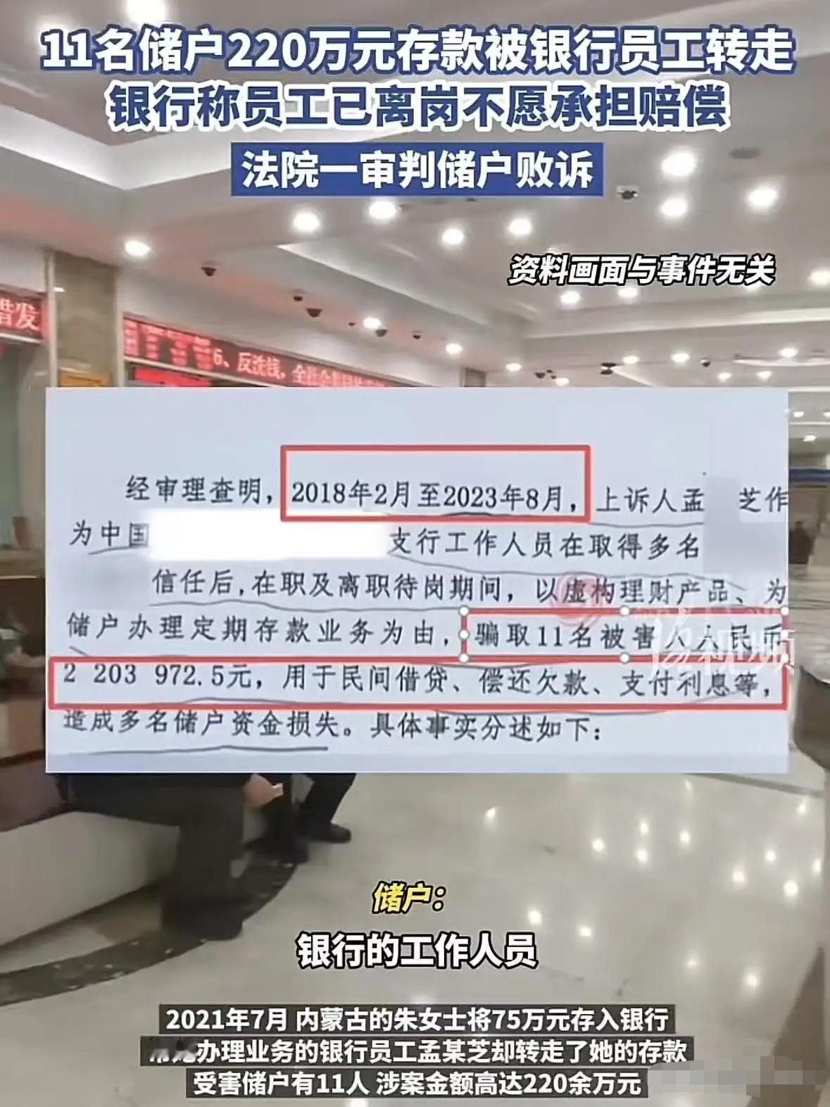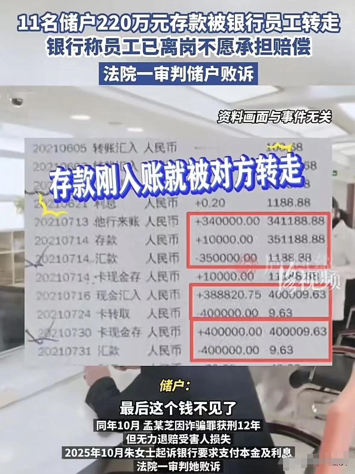 揪心!11名储户的220万元存款,竟被银行内部员工私自划转。涉事银行以员工个人违法、现已离职为由,拒不承担赔付责任。储户依法维权却一审败诉,存款追回陷入困境。事件暴露出银行内部管控存在明显漏洞,存款安全问题引发社会高度关注。