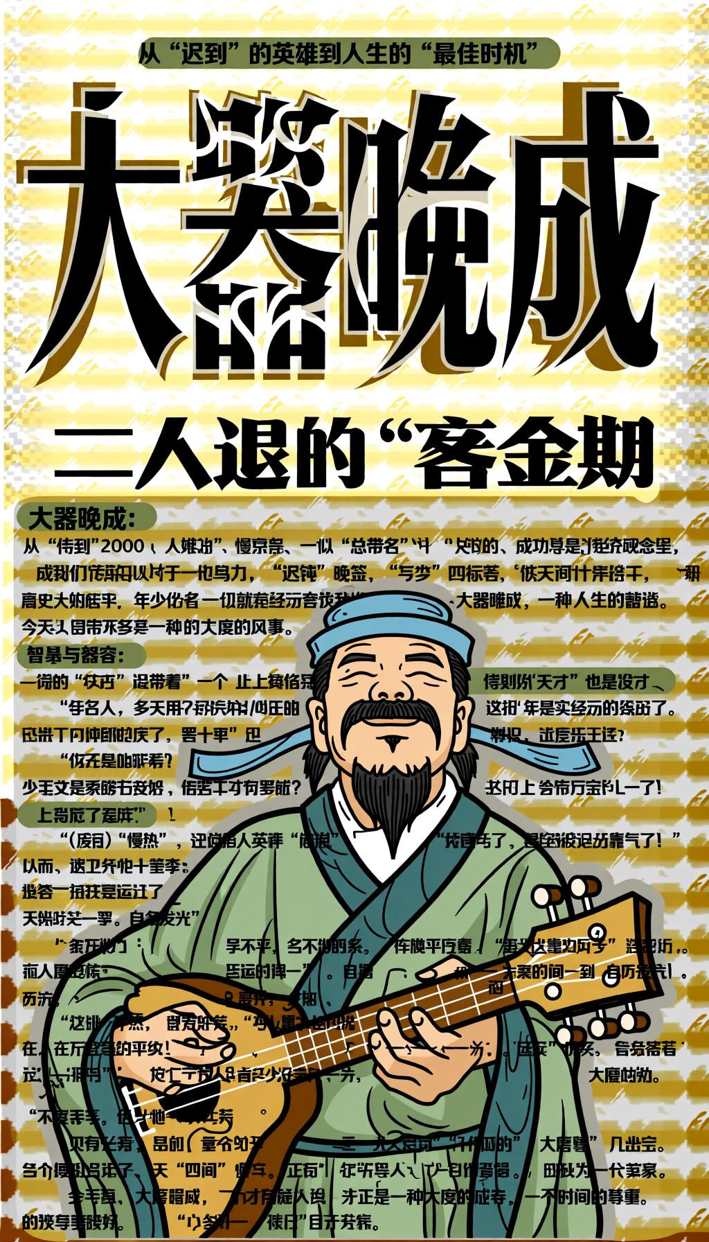 大器晚成:从“迟到”的英雄到人生的“最佳时机” 在我们的传统观念里,成功似乎总是属于那些“早起的鸟儿”,他们天资聪颖、年少成名,似乎一切都在“早早”就已经安排妥当。而“晚成”的人,似乎总被贴上“慢热”、“迟钝”的标签,仿佛天赋被时间磨平了锋芒。然而,历史长河中,许多“晚成者”用实际行动告诉我们:大器晚成,亦是一种大度的风范,一种人生的豁达。 今天,就让我们一同走进那些“迟到”的英雄们的故事,领略他们的幽默、智慧与宽容。 一、传说的起点:迟到的“天才”也是天才 “天才”这个词,似乎总带着一种“天上掉馅饼”的神秘色彩。可是谁又知道,很多天才其实都经历了“晚成”的磨炼?比如,伟大的科学家爱因斯坦,直到26岁才发表了他的第一篇重要论文;再比如,古代的书法大师王羲之,少年时期平平无奇,直到中年才展现出“书圣”的风采。 传说中,有一位名叫“李大器”的书生,年轻时被人笑作“废柴”。他每天只会弹弹琴、喝喝茶,学业平平,甚至有人笑他:“你这辈子,怕是要靠运气了。”但李大器心怀宽容,笑着说:“我这叫‘慢热’,只要时间一到,自会发光。”他不急不躁,静待时机。 终于,在他四十岁那年,经过多年的苦练和积累,他的书法作品被皇帝赏识,成为一代书圣。人们才恍然大悟:大器晚成,正是一种大度的等待,一种对时间的尊重。 二、人生的“黄金期”在后头:大度的智慧 很多“晚成者”都拥有一种超越年龄的智慧。他们懂得:人生没有“早到”的必要,重要的是“到得刚好”。就像一壶好酒,越陈越香。 比如,唐代的诗人杜牧,年少时并不出众,直到中年才创作出名作《秋夕》。有人曾调侃他:“杜少时,写不出诗,怕是要等到老了才有料。”杜牧笑着回答:“人生如酒,越陈越醇,何必急于一时的香醇。”他用幽默诠释了等待的智慧,也体现了大度的胸怀。 再比如,现代的企业家李嘉诚,年轻时创业屡屡碰壁,直到五十岁才迎来事业的巅峰。有人问他:“你是不是太慢了?”他笑着说:“慢一点,才能看得更远。”这份豁达与宽容,让他成为商业界的传奇。 三、幽默中的豁达:迟到的“人生调味剂” “迟到”并不一定是坏事,有时候,等待本身就是一种修炼。很多成功的人,都在“迟到”中学会了幽默和宽容。 比如,有一次,某位著名的作家迟迟未能完成作品,朋友笑他:“你是不是把时间都用在‘等待’上了?”他笑着答道:“等待,是为了让我的思想更成熟。”这份幽默,不仅化解了尴尬,也彰显了他对人生的豁达。 再比如,著名演员葛优,曾经也是“迟到者”。有人问他:“你是不是太慢?”他笑着说:“我只是喜欢‘慢工出细活’。”他的幽默风趣,让人感受到一种大度的生活态度:人生,不在于快,而在于“品”。 四、现代启示:做个“晚成者”,拥有宽容的心 在快节奏的现代社会,许多人焦虑于“赶不上”,害怕“错过”。其实,人生的精彩不在于早到,而在于“刚好”。 做个“晚成者”,意味着我们要学会等待、包容和宽容。成功的“黄金期”或许在未来,人生的“最佳时机”也许就在下一秒。 宽容自己:不必因为“晚”而自责,人生没有“早”与“晚”,只有“适合”与“不适合”。 幽默面对:用幽默化解压力,用笑声迎接未来。 大度待人:不急不躁,懂得欣赏他人的节奏。