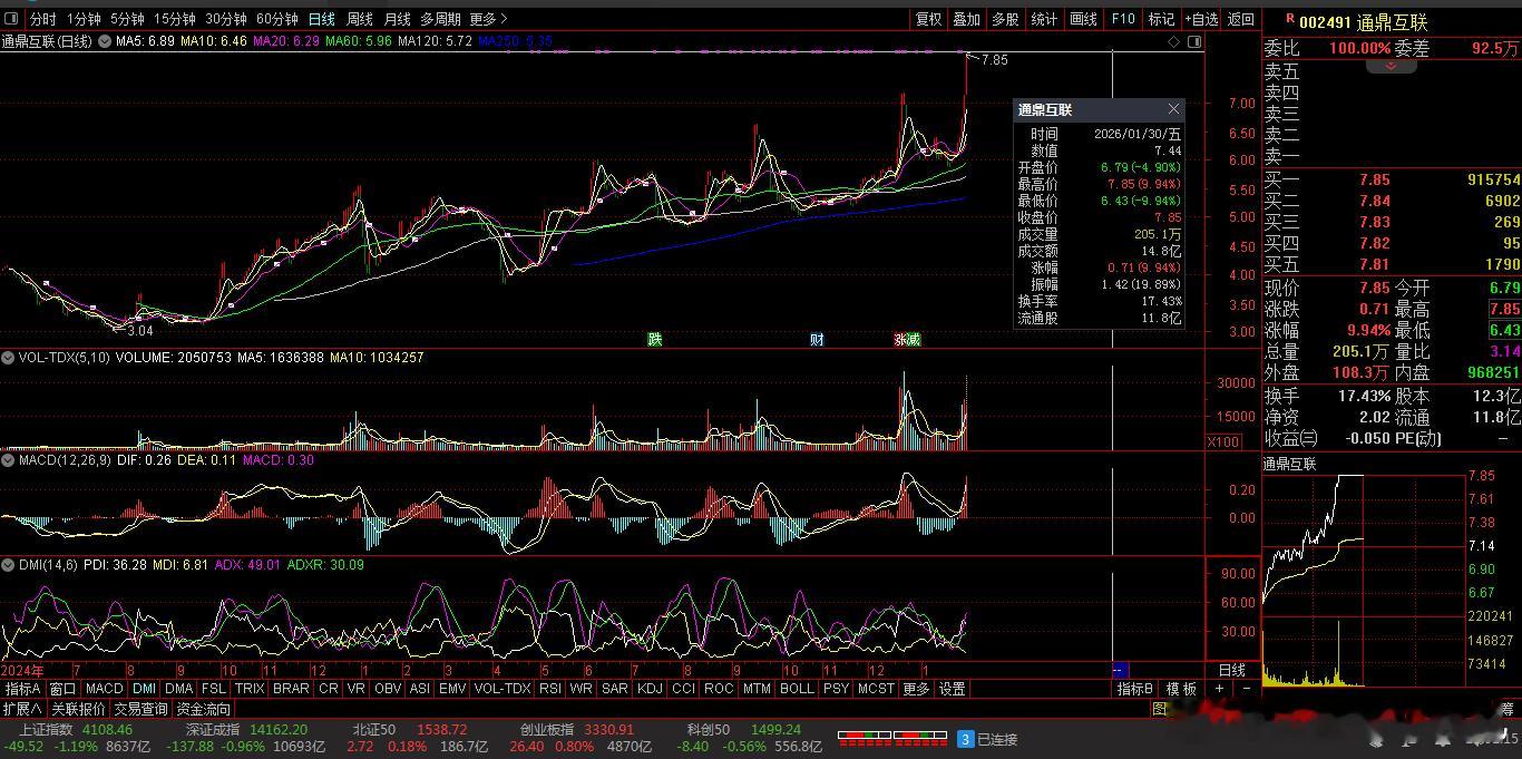 收盘价:7.85元。涨跌幅:9.94%。股票连涨:8天。