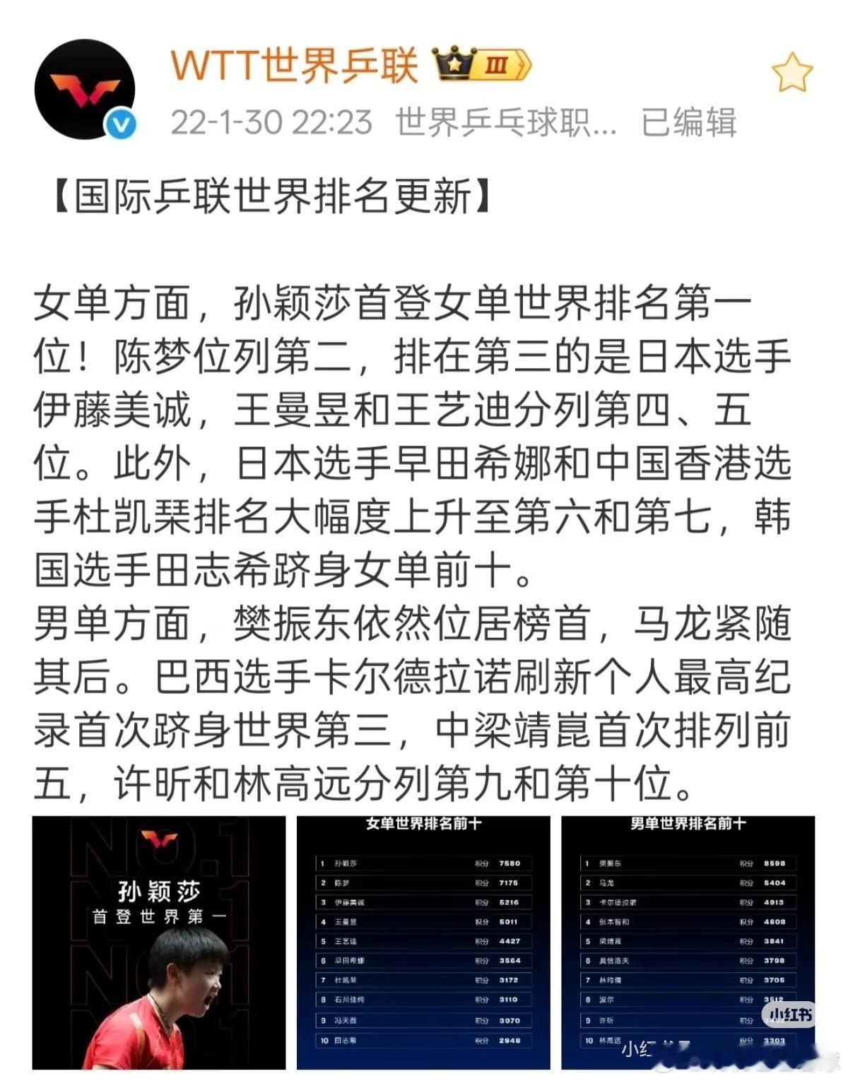 孙颖莎首登世界第一四周年纪念日孙颖莎第一次登顶世界第一是2022年1月30日,至今日已是教育四周年了!世界排名新积分体系下首位00后积分破万的球员且最高积分记录保持者!莎莎你最棒!