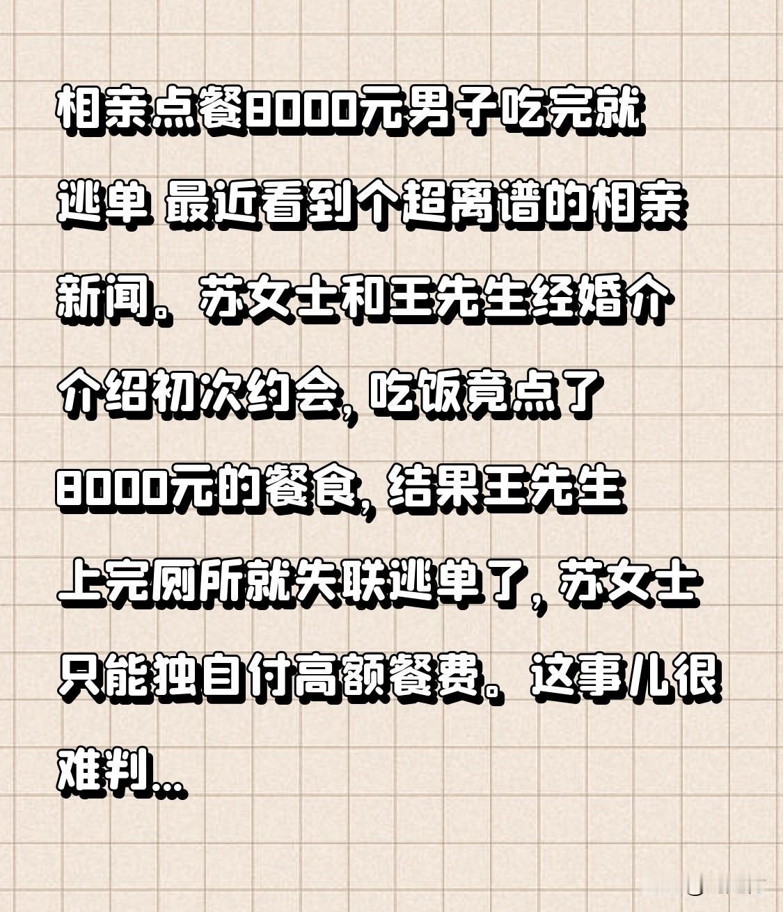 相亲点餐8000元男子吃完就逃单 相亲点餐8000元,男子吃完逃单 近日,一则离谱的相亲新闻引发关注。苏女士与王先生经婚介介绍初次约会,用餐竟点了价值8000元的餐食。结果,王先生上完厕所便失联逃单,苏女士只能独自承担高额餐费。 此事难以判断谁是“大冤种”。或许苏女士是饭托,想让王先生买单以抽取提成,却被对方识破;又或许苏女士是拜金女,试图试探王先生的财力,却反被算计;还有可能王先生才是饭托,故意逃单让苏女士付账获利。目前信息有限,只能等更多细节曝光,看这场奇葩相亲闹剧背后究竟是谁在作祟。