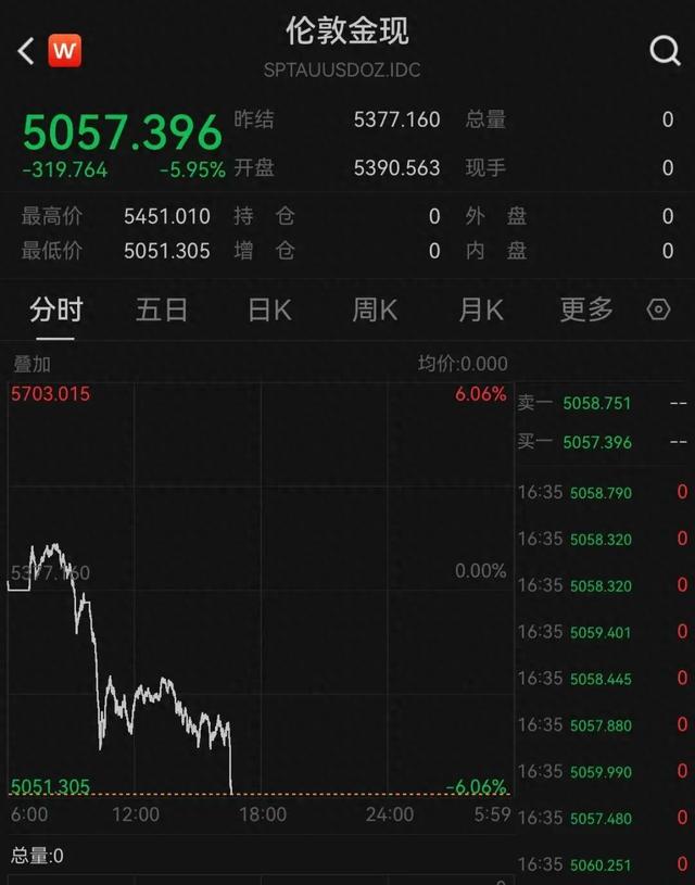 30日下午,现货黄金再次短线跳水,跌破5100美元,现报5057.396美元/盎司,跌近6%。