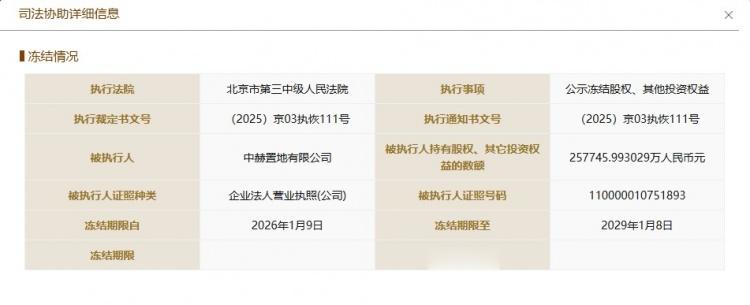 信息显示,该冻结期限自2026年1月9日至2029年1月8日,共1095天。被执行人持有股权、其它投资权益的数额为257745.993029万元人民币。