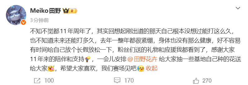 不知不觉都11年周年了,其实回想起刚出道的那天自己根本没想过能打这么久,也不知道未来还能打多久,去年一整年都很紧绷,身体也没有那么健康,好不容易有时间给自己放个长假放松一下,粉丝们送的礼物和应援我都看到了,感谢大家11年来的陪伴和支持,一会儿安排田野花卉给大家抽一些基地自己种的花送给大家,希望大家喜欢,我们赛场见吧。
