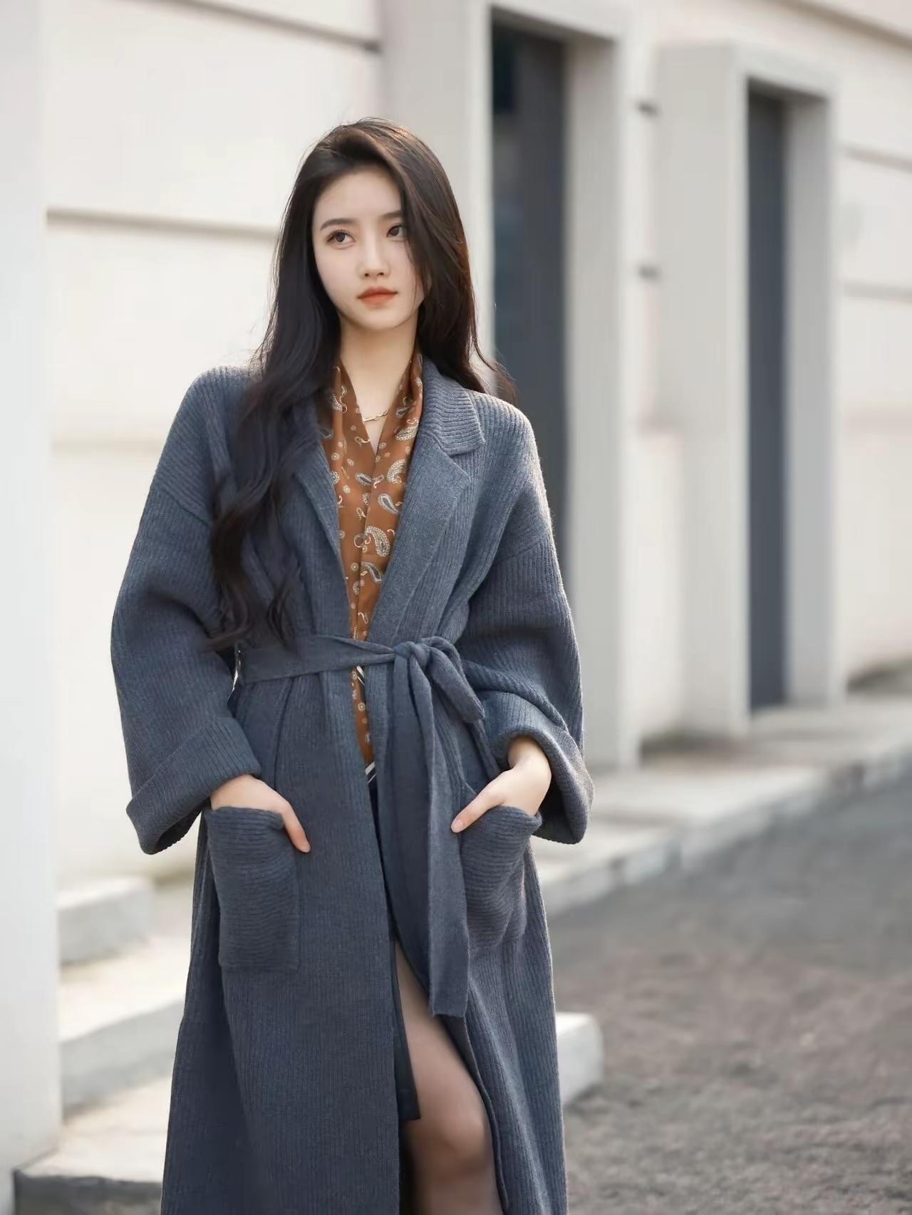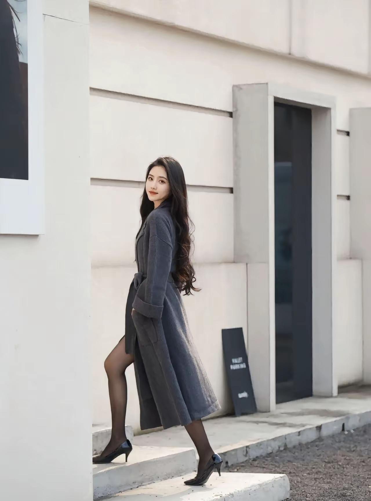 优雅穿搭风格系列/长发飘飘的模特麻豆,身穿优雅长外套,配上黑丝小皮鞋,气质拉满,