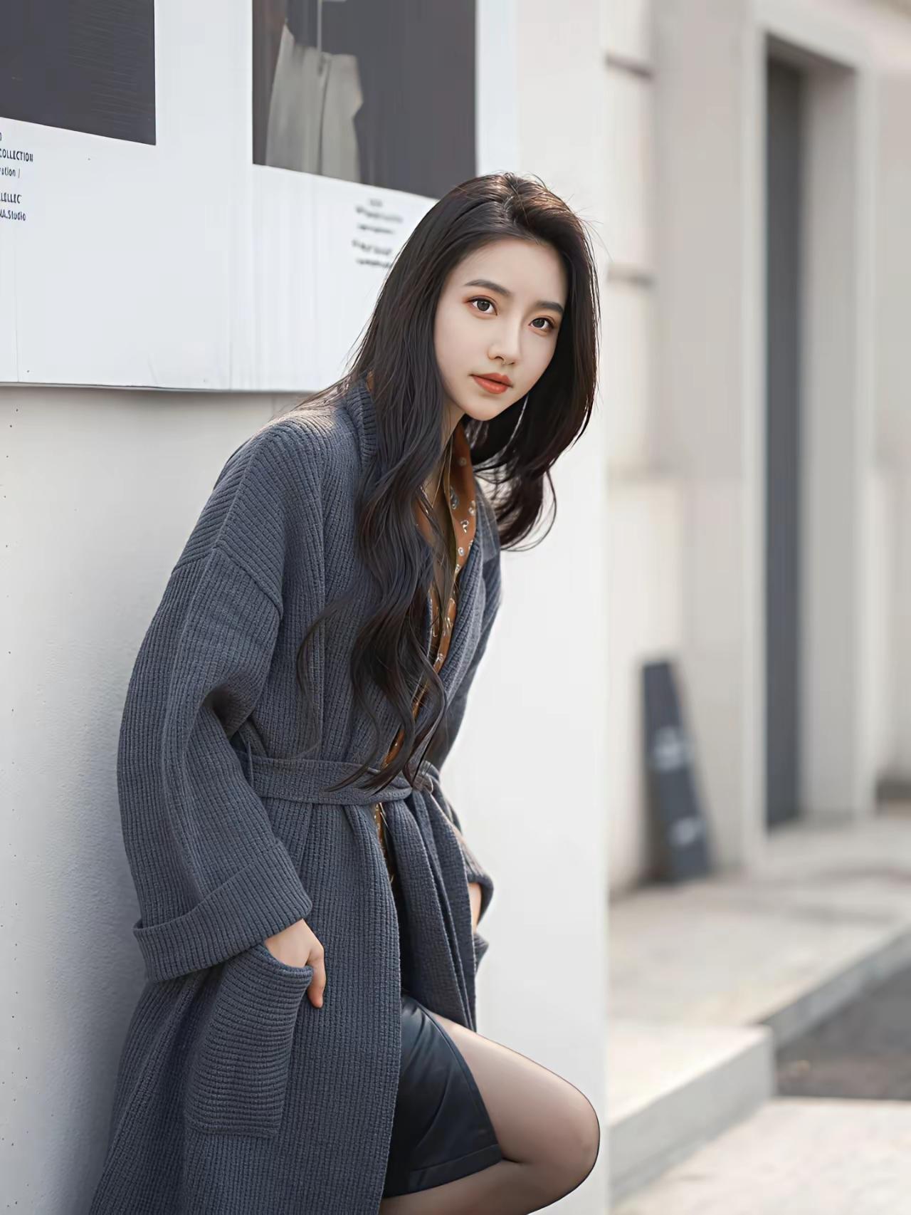 优雅穿搭风格系列/长发飘飘的模特麻豆,身穿优雅长外套,配上黑丝小皮鞋,气质拉满,完美的秋日时尚指南麻豆街拍 麻豆街拍美女 气质麻衫上衣