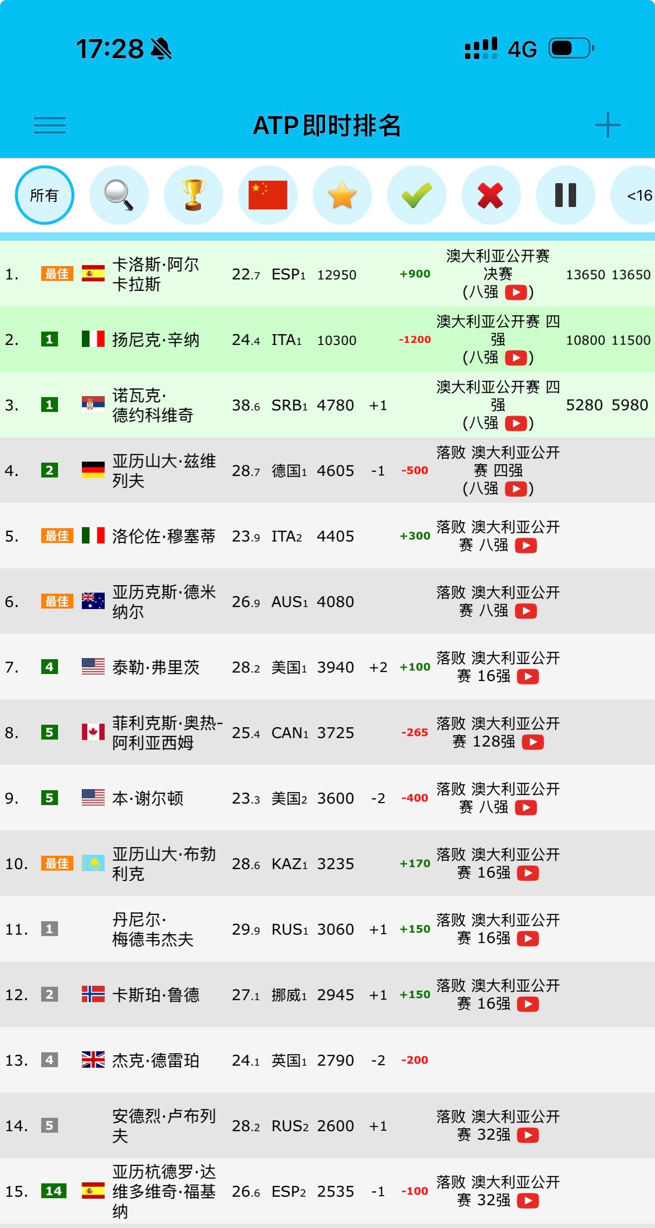阿尔卡拉斯首进澳网男单决赛 阿卡拿到澳网决赛门票后,即时ATP积分来到了12950分,牢牢的把握世界第一的排名,辛纳和德约科维奇分列2—3位,兹韦列夫没有保卫住去年亚军的积分,即时排名掉到了第4(4605)。阿尔卡拉斯连续四个大满贯进决赛