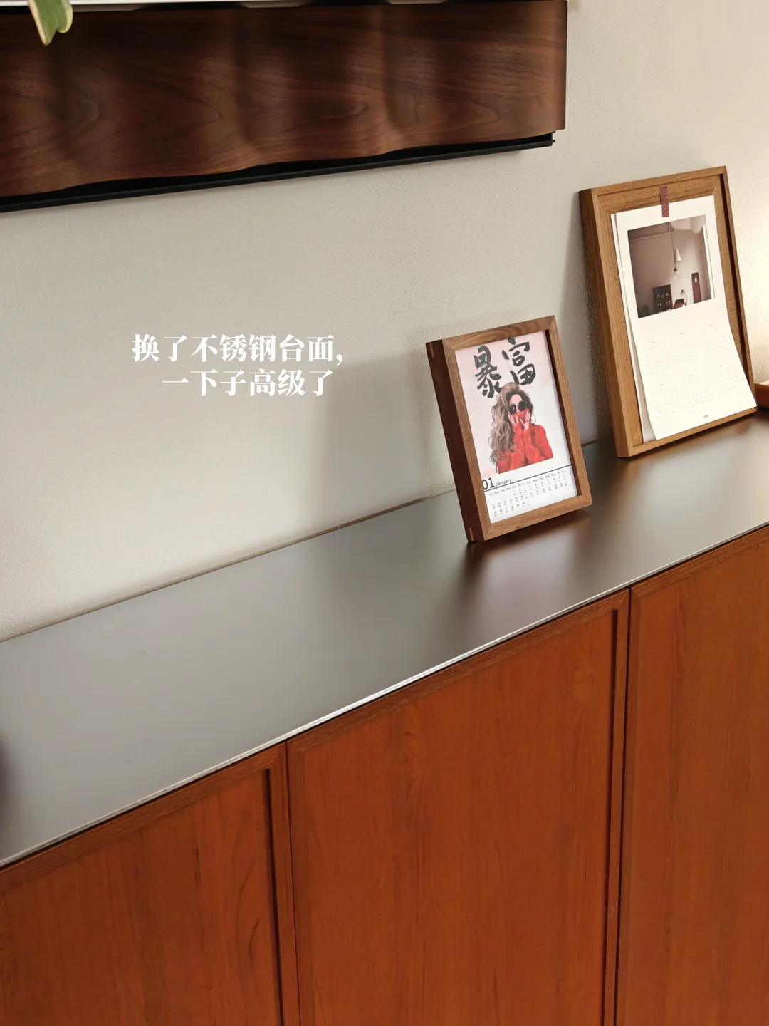 在上看到一个柚木柜门配不锈钢台面的柜子,