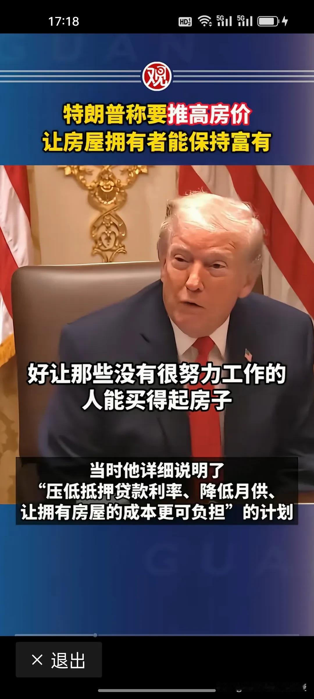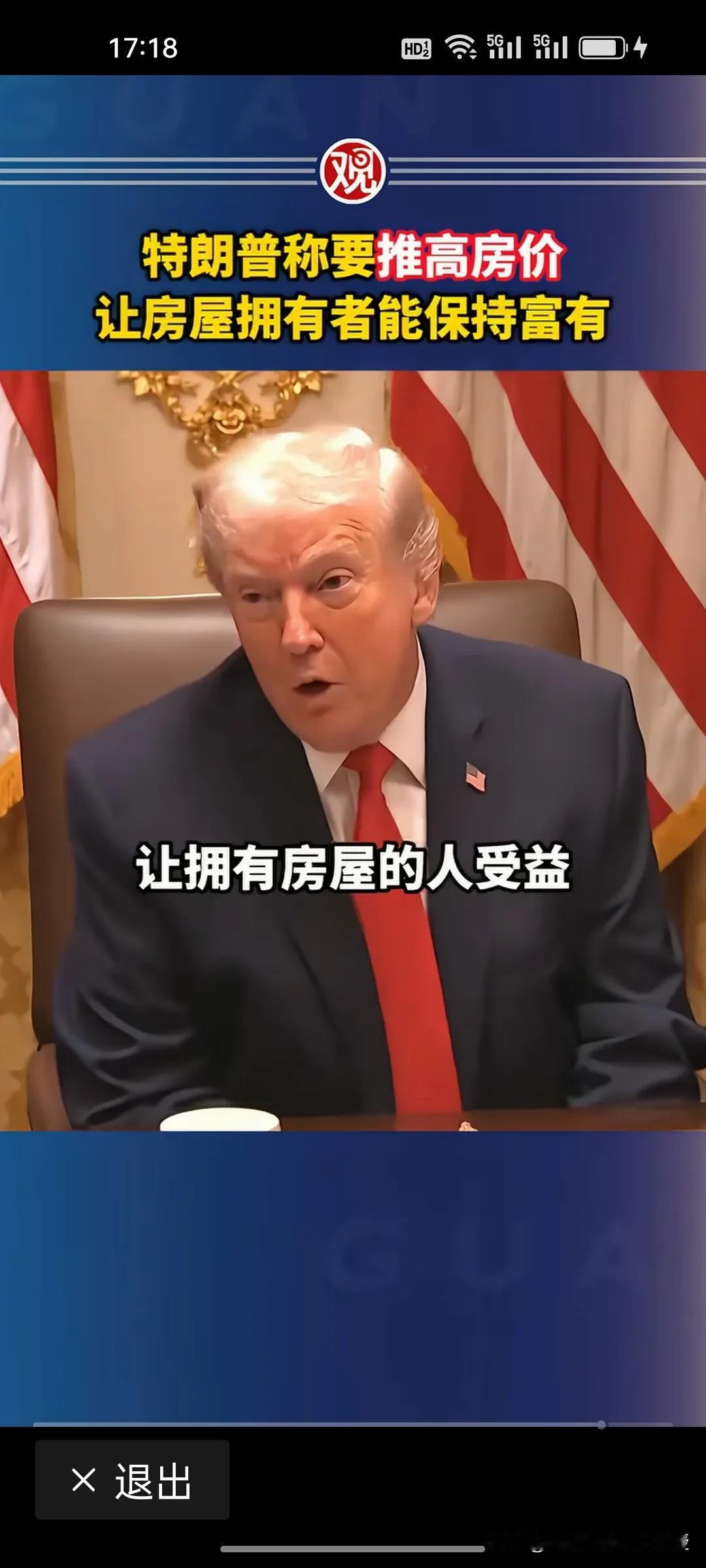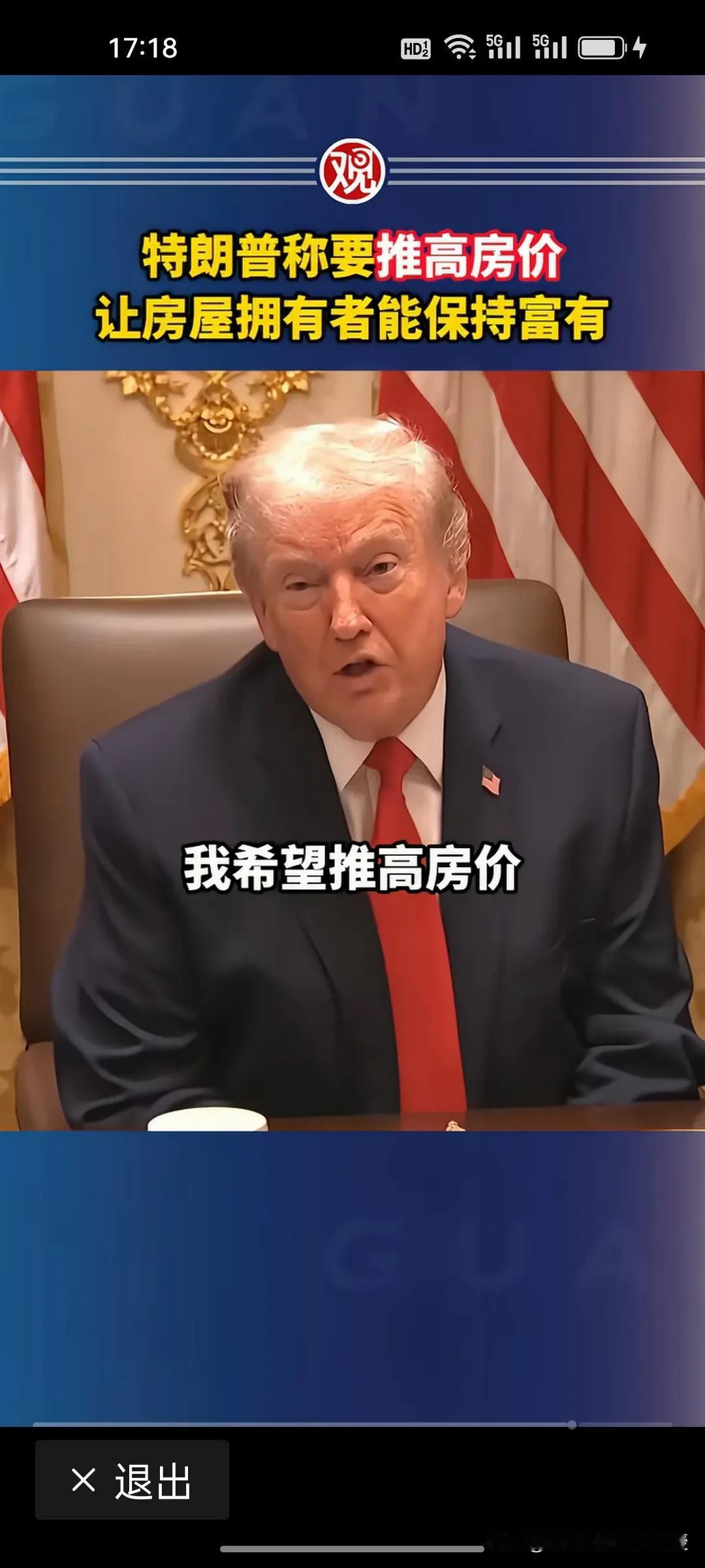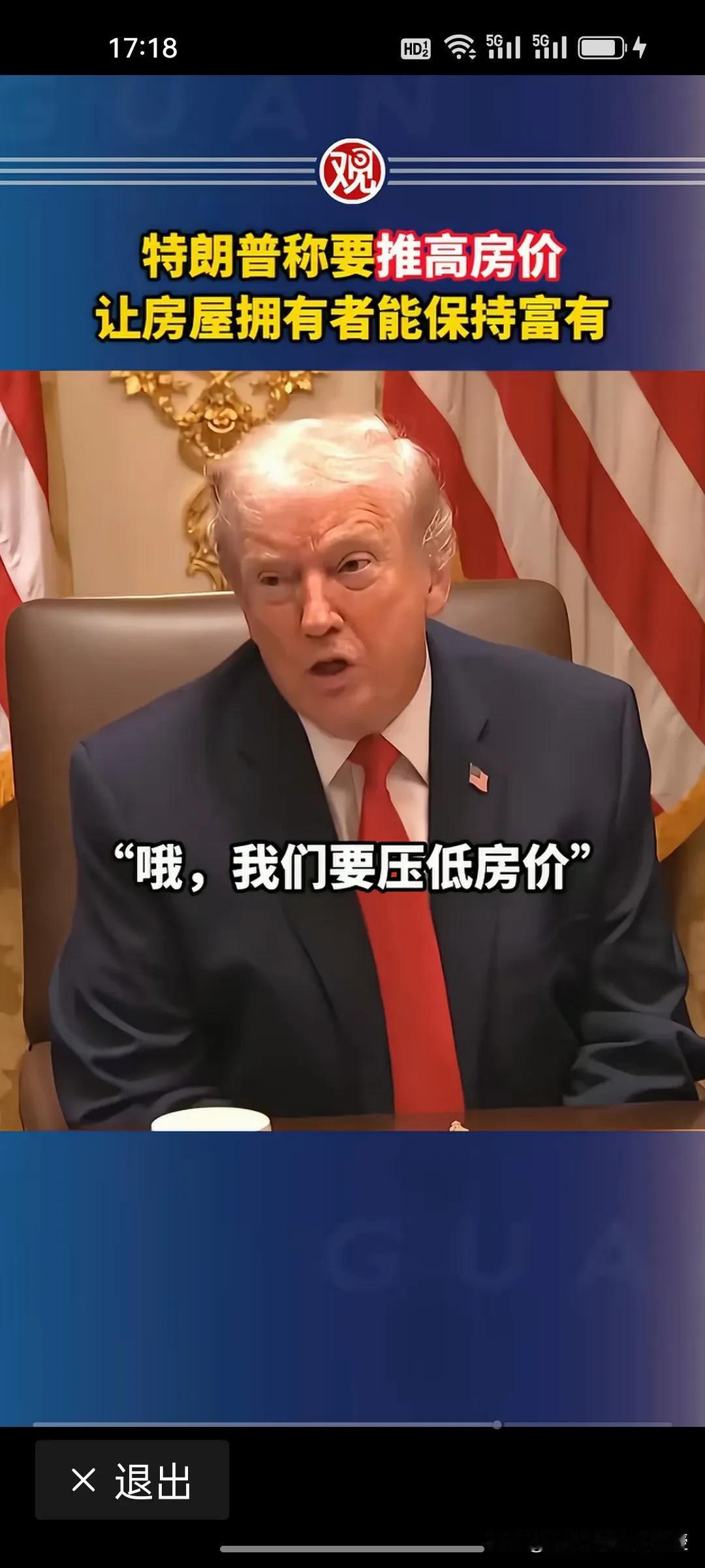 特朗普又曝惊人言论:推高房价,让房主更富有! 根据《观察者网》最新报道,特朗普在内阁会议上直言要推高房价,让房屋拥有者保持富有,还特意强调不能让“没努力工作的人”占便宜。 这和他几周前喊的“压低房贷利率、降低月供”住房可负担计划,堪称大型打脸现场。一边承诺让普通人买得起房,一边转头维护有房阶层利益,这种双标操作把“为富人站台”的本质暴露无遗。 说到底,在他眼里,房主的财富远比普通人的住房刚需重要得多。毕竟他家族的主业就是房地产,房价跌了,特朗普家族的财富也会大缩水。