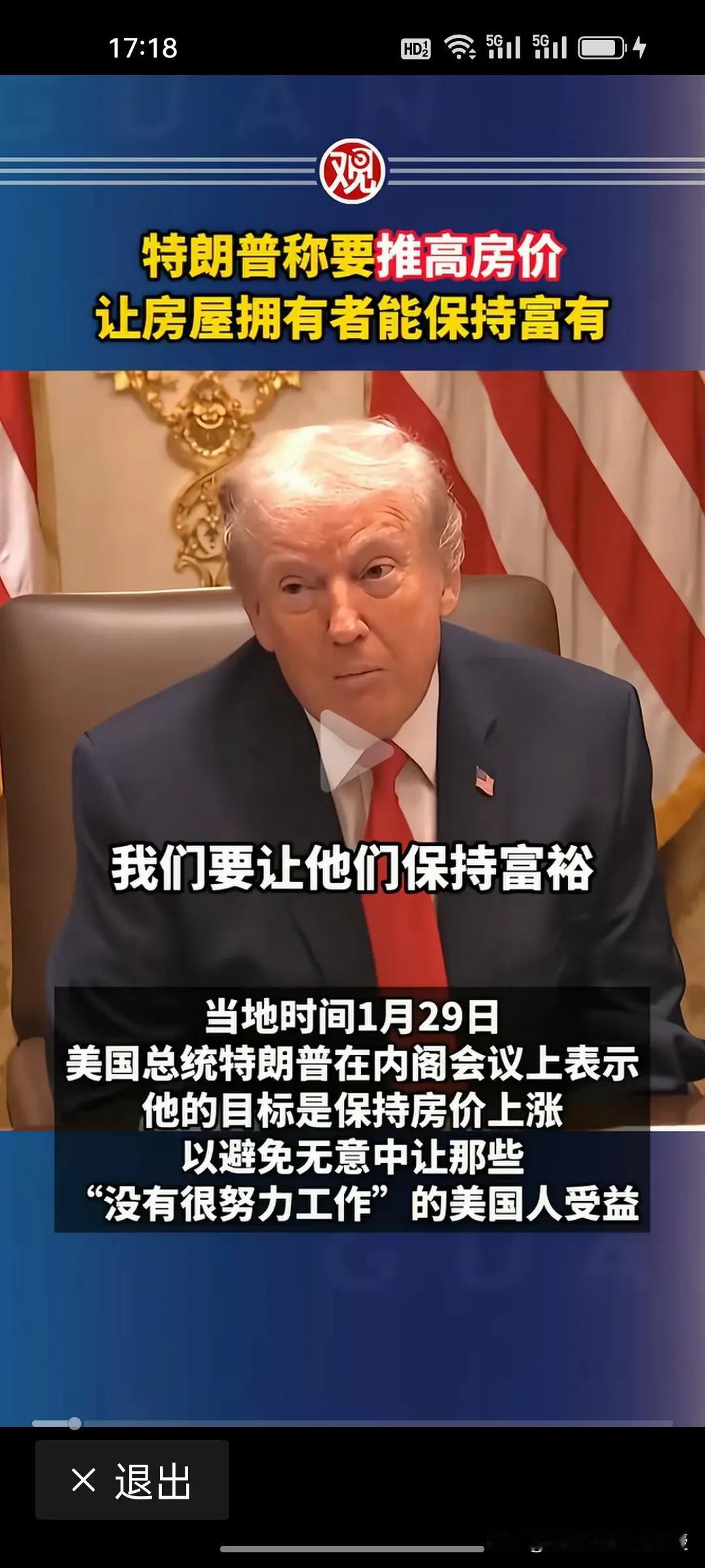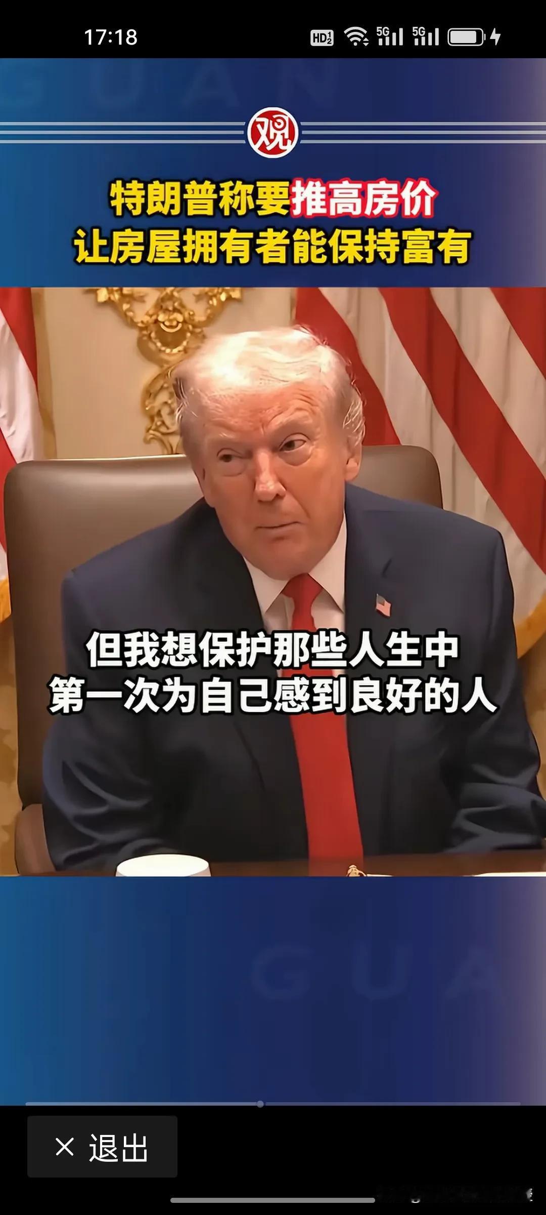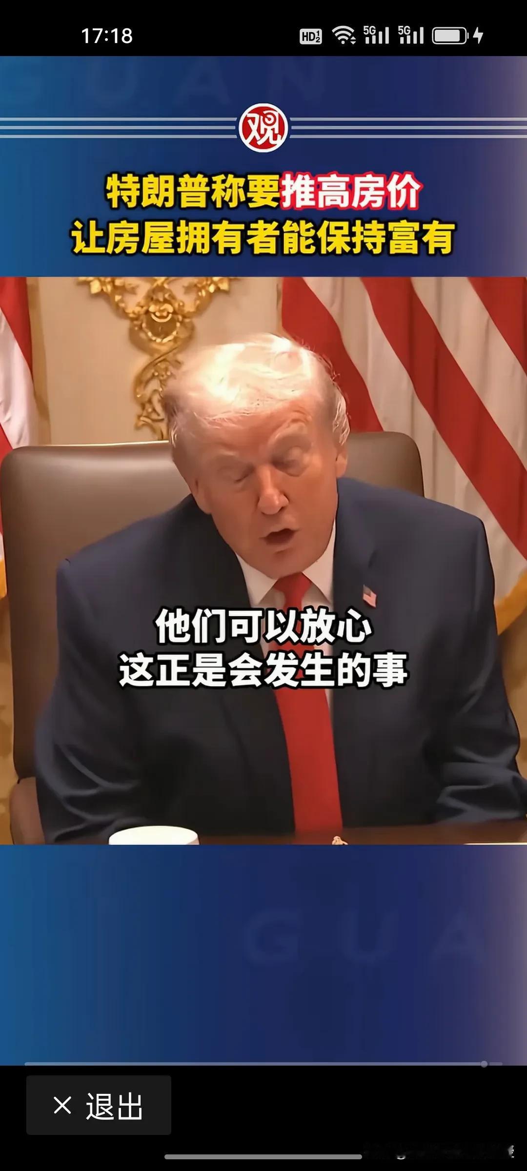 特朗普又曝惊人言论:推高房价,让房主更富有! 根据《观察者网》最新报道,特朗普在内阁会议上直言要推高房价,让房屋拥有者保持富有,还特意强调不能让“没努力工作的人”占便宜。 这和他几周前喊的“压低房贷利率、降低月供”住房可负担计划,堪称大型打脸现场。一边承诺让普通人买得起房,一边转头维护有房阶层利益,这种双标操作把“为富人站台”的本质暴露无遗。 说到底,在他眼里,房主的财富远比普通人的住房刚需重要得多。毕竟他家族的主业就是房地产,房价跌了,特朗普家族的财富也会大缩水。