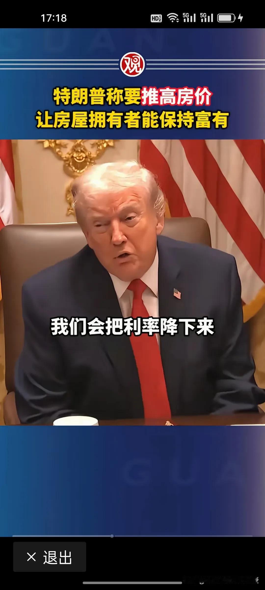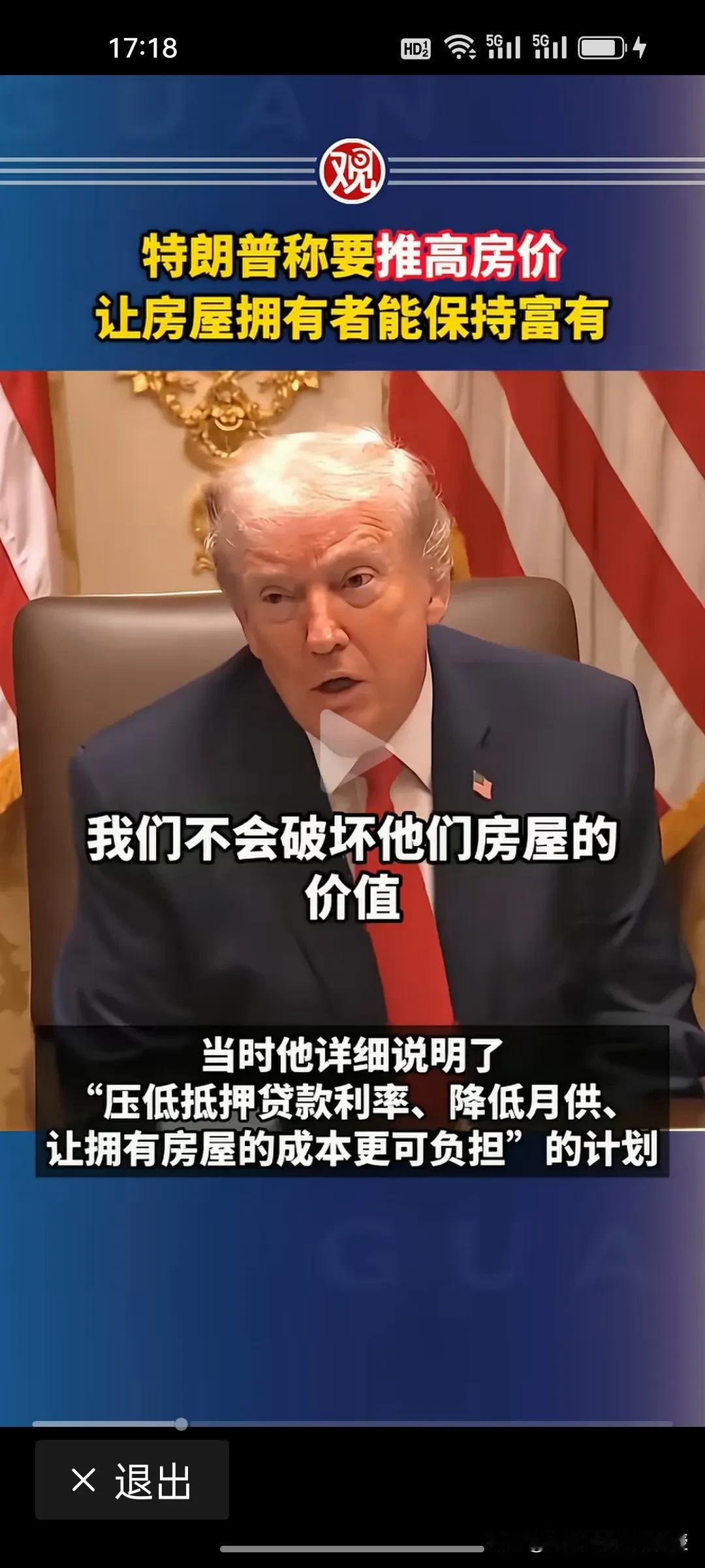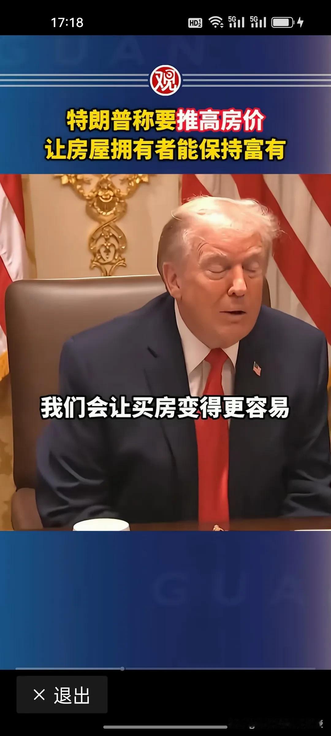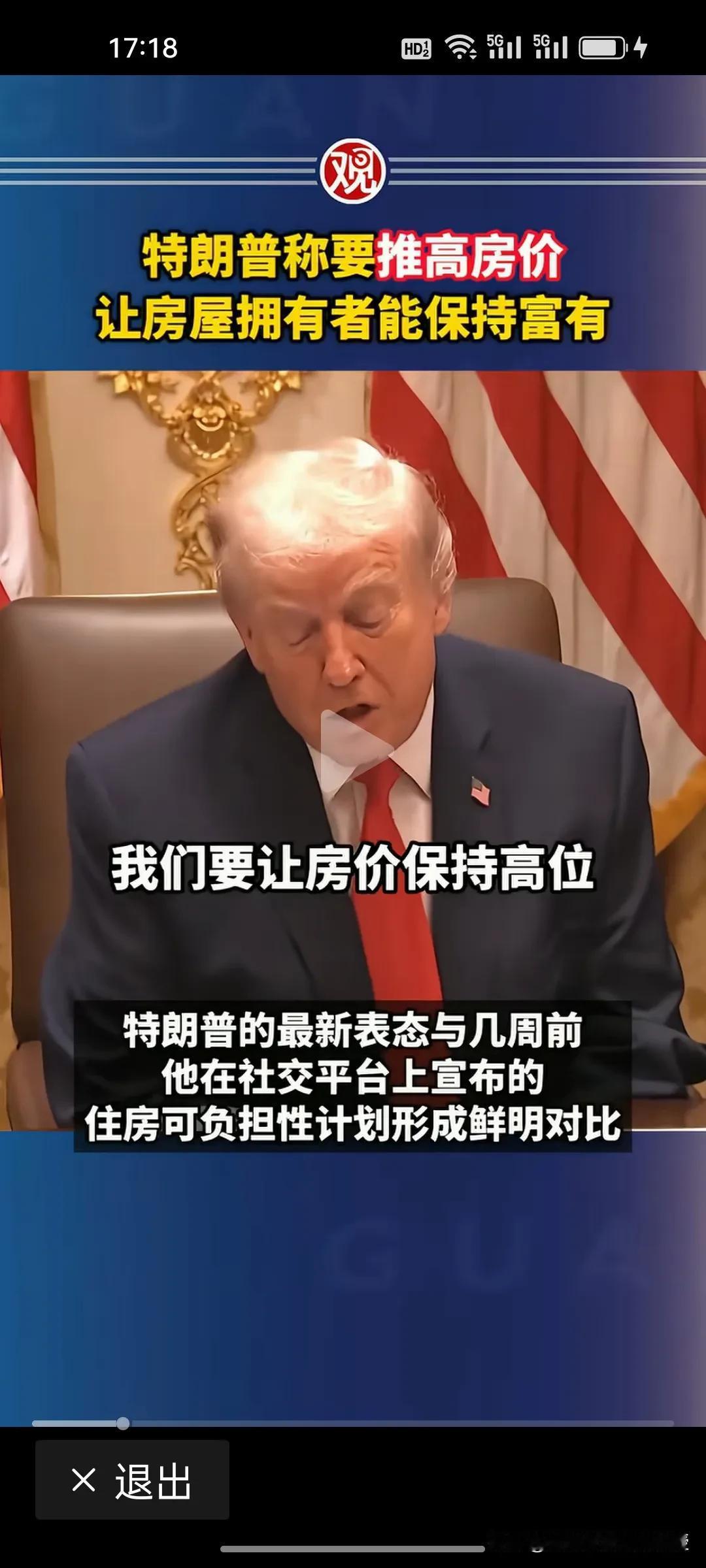 特朗普又曝惊人言论:推高房价,让房主更富有! 根据《观察者网》最新报道,特朗普在内阁会议上直言要推高房价,让房屋拥有者保持富有,还特意强调不能让“没努力工作的人”占便宜。 这和他几周前喊的“压低房贷利率、降低月供”住房可负担计划,堪称大型打脸现场。一边承诺让普通人买得起房,一边转头维护有房阶层利益,这种双标操作把“为富人站台”的本质暴露无遗。 说到底,在他眼里,房主的财富远比普通人的住房刚需重要得多。毕竟他家族的主业就是房地产,房价跌了,特朗普家族的财富也会大缩水。