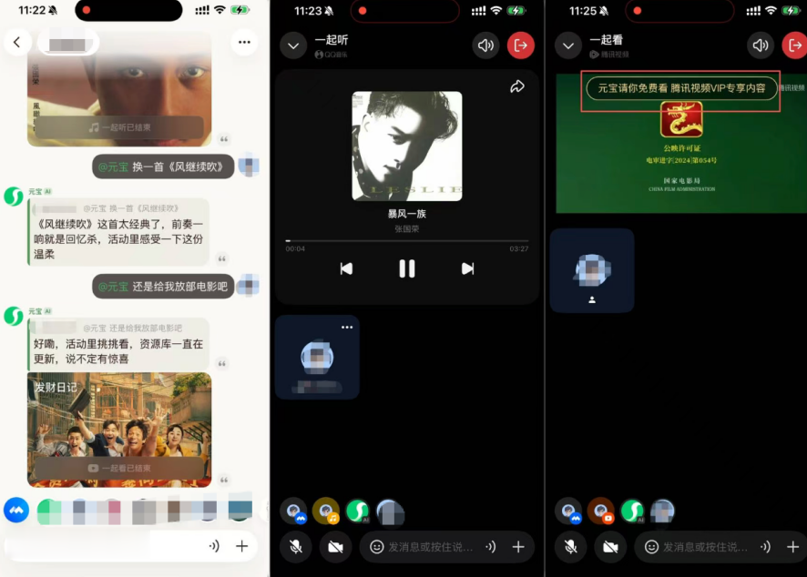 记者从今天泄露的公测版截图看到,在该AI助手上新增”一起听音乐“与”一起看视频“功能,疑似打通QQ音乐与腾讯视频内容库。这意味着用户可直接在元宝派里,听QQ音乐会员歌曲、看腾讯视频会员电影。