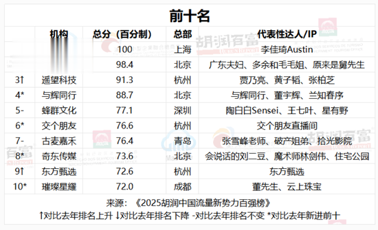 1月21日,胡润研究院发布了《2025胡润中国流量新势力百强榜》,这份榜单的上榜机构平均拥有2.8亿粉丝和530位签约达人,竞争异常激烈,而与辉同行作为新面孔,首次上榜就位列第四,排在了美ONE、无忧传媒和遥望科技这些行业巨头之后。