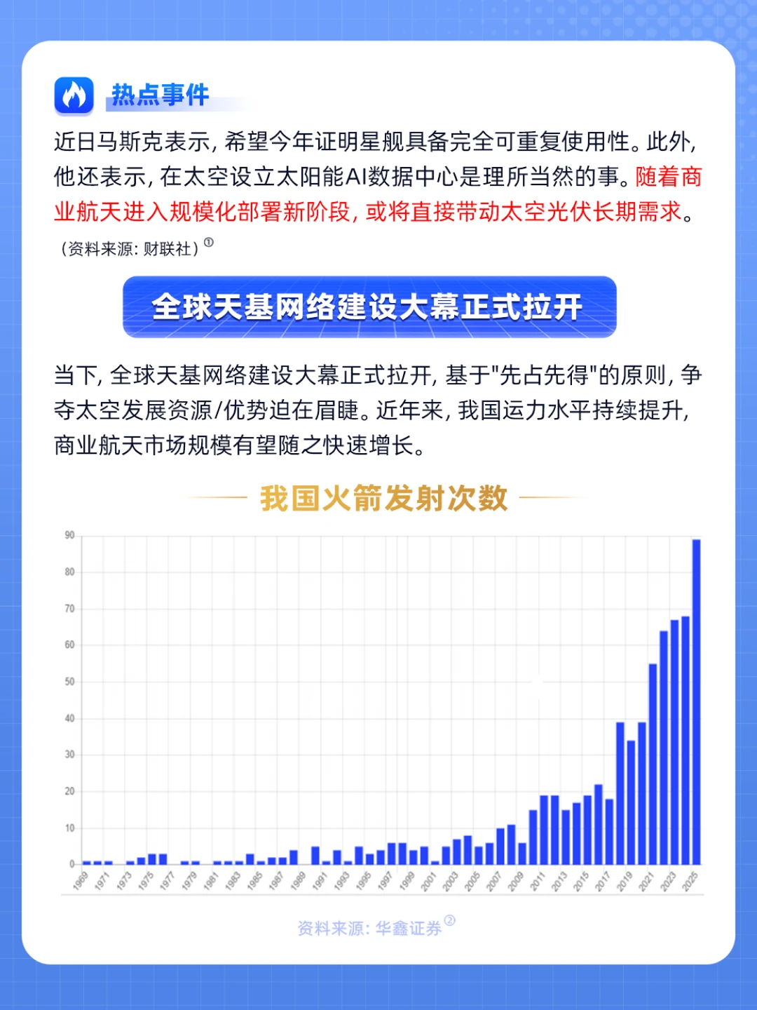📅近日马斯克表示, 🚀希望今年证明星舰具备完全可重复使用性。 💬此外,他还表示, 🌞在太空设立太阳能AI数据中心是理所当然的事。 🌃随着商业航天进入规模化部署新阶段, 💡或将直接带动太空光伏长期需求。