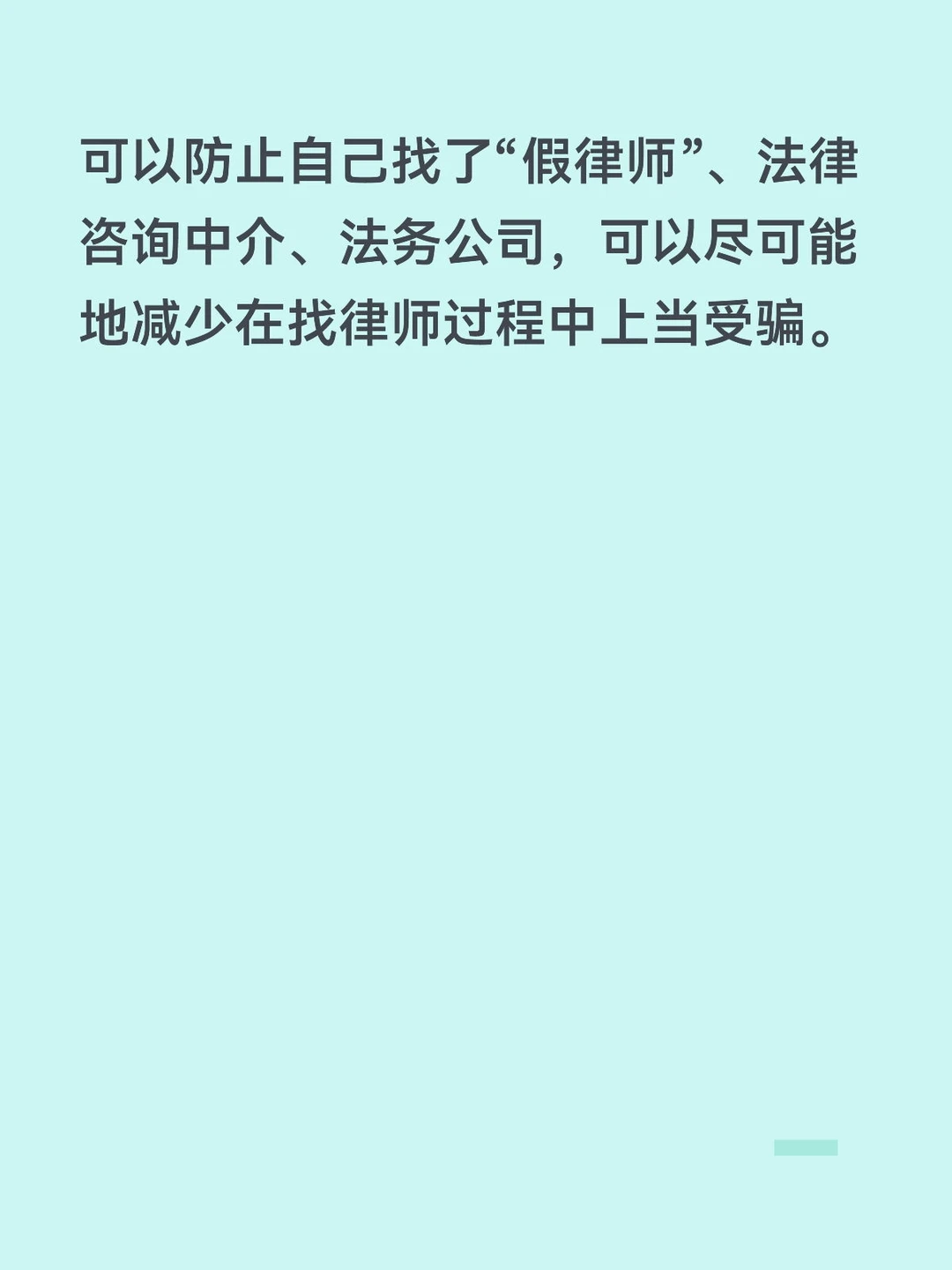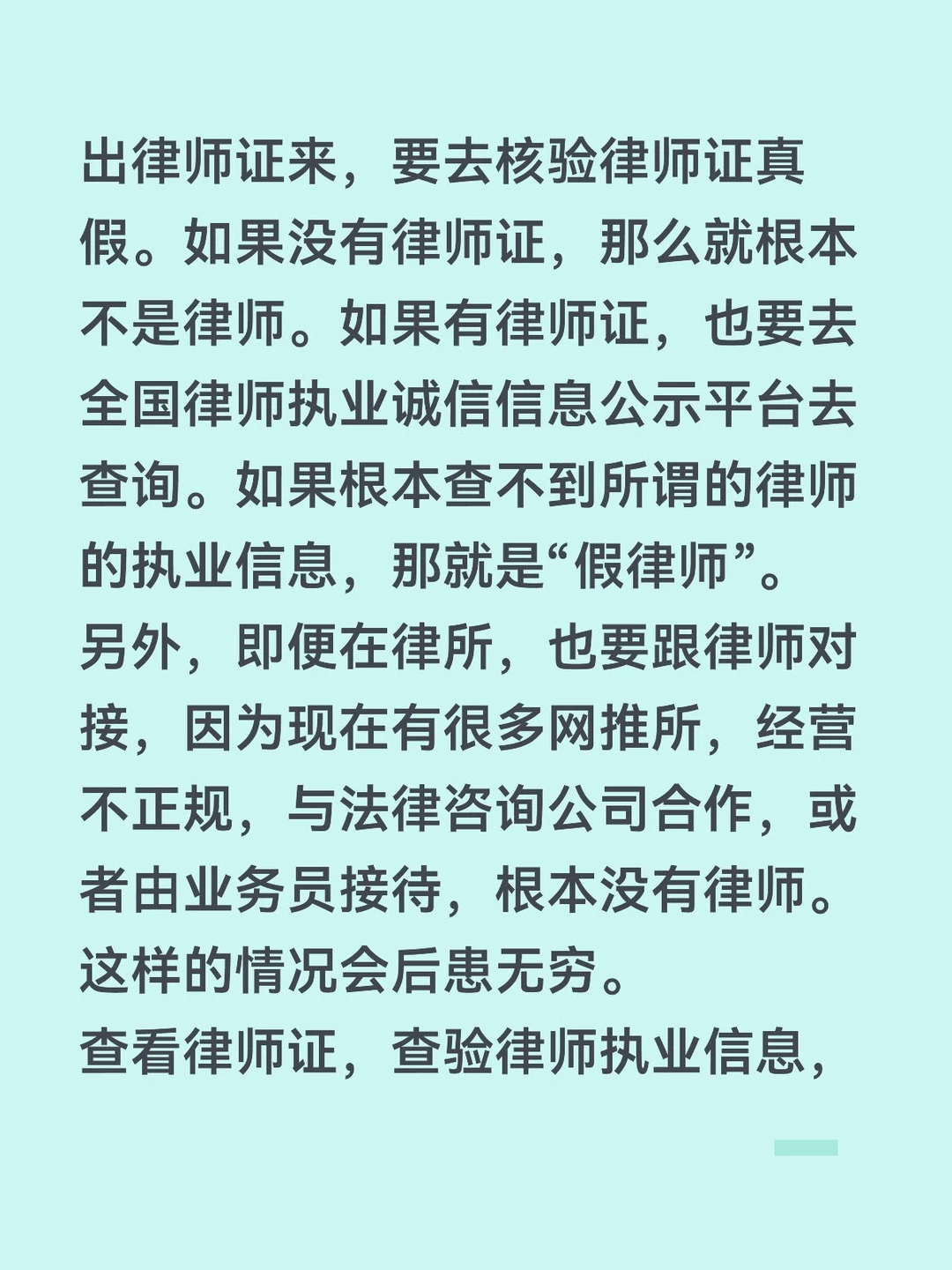 查看律师证,查验律师执业信息,可以防止自己找了“假律师”、法律咨询中介、法务公司,可以尽可能地减少在找律师过程中上当受骗。