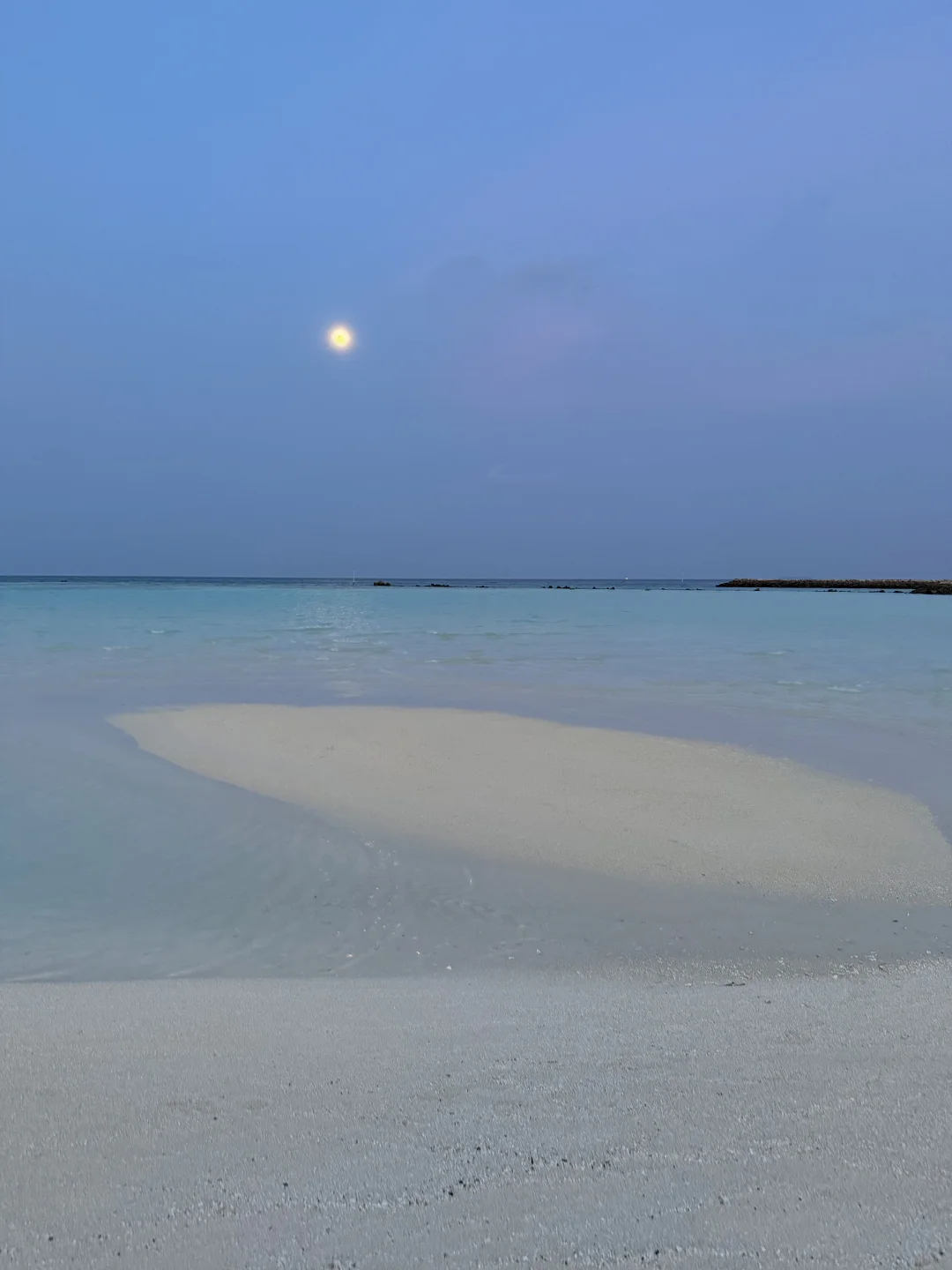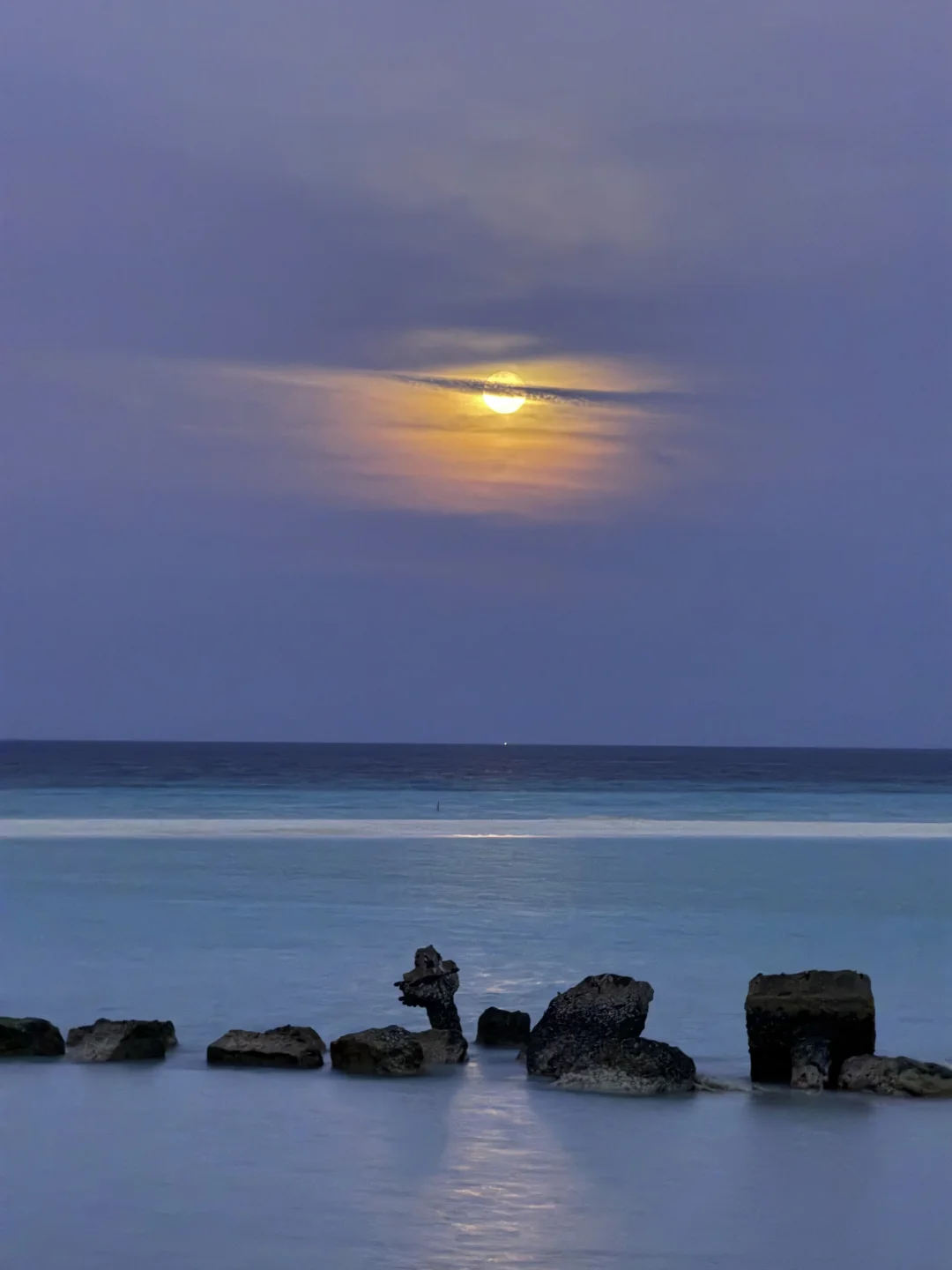 日出&日落都能看!黄昏时分 左手夕阳右手升月 赶上退潮还有额外小拖尾 岛主在月色下静立…那画面我一辈子记得