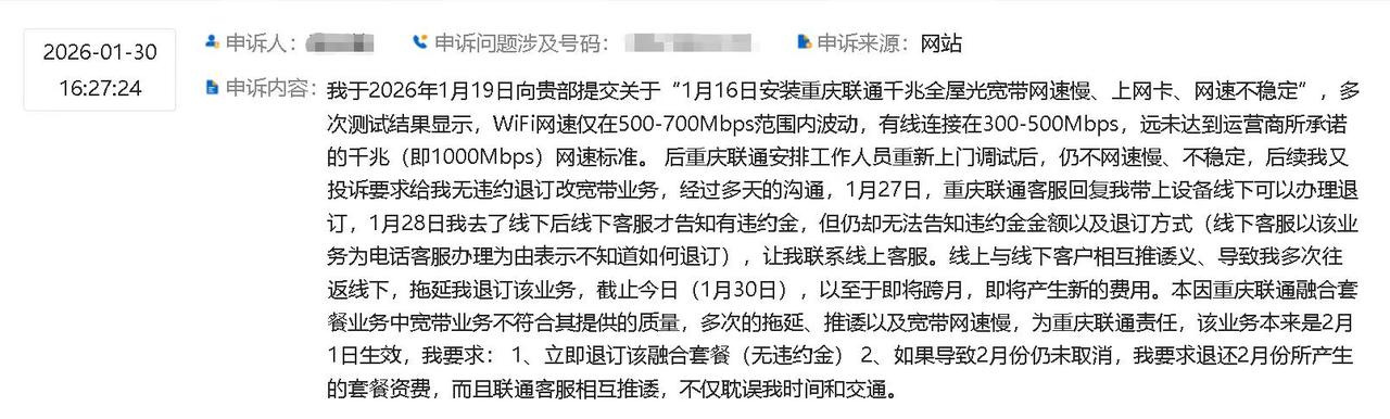 网速严重缩水!重庆联通千兆全屋光宽带网速。2026年1月16日通过中国联通客服热线10010,办理了“119元千兆全屋光宽带融合套餐”。安装师傅于当日上门安装完成后,我立即在安装的路由器(WiFi7路由器)旁边1米范围内,使用支持WiFi7的华为Mate80手机进行现场网速测试。多次测试结果显示,WiFi网速仅在500-700Mbps范围内波动,有线连接在300-500Mbps,远未达到运营商所承诺的千兆(即1000Mbps)网速标准。 根据《电信服务规范》及相关规定,运营商提供的宽带接入速率应满足签约速率的90%以上(有线直连条件下)。