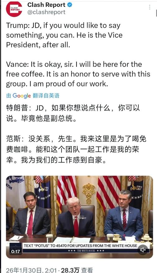 万斯遭遇耻辱一幕!特朗普:有话就说,毕竟你副总统 美国当地时间1月29号,特朗普主持召开内阁会议,当着所有内阁成员的面,抛出一个震惊全球的猛料——他亲口宣称,普京已经同意,一周内暂停对乌克兰基辅及其他城镇的空袭,还特意强调,这事是他亲自请求普京才促成的。 这话一出,立马引发全球关注,毕竟俄乌冲突打了这么久,双方一直僵持不下,尤其是冬天来临后,俄军对乌克兰能源设施的空袭就没停过,乌克兰民众苦不堪言。 所有人都没想到,特朗普居然说自己促成了停火,口气大得没边,毕竟特朗普向来喜欢自吹自擂,不管啥事都能往自己身上揽。 这次内阁会议上,他除了提停火的事,还透露了另一个重要消息——会在下周公布美联储主席的提名人选,两件大事凑在一起,故意营造出一种“掌控全局”的架势。 特朗普在会上说得有模有样,直言之所以能促成停火,全是他的功劳。 他还特意解释,现在乌克兰正遭遇极度严寒,老百姓连取暖都成问题,他看着于心不忍,就亲自给普京发消息、通电话请求,普京最终被他的诚意打动,才同意暂停空袭一周。 他还着重强调,这次停火主要是为了保护乌克兰的能源设施,毕竟冬天能源设施要是被炸毁,乌克兰民众根本熬不过去,这话听着冠冕堂皇,可明眼人都能看出来,他就是想借着这事,彰显自己的外交能力,为自己捞取政治资本。 让人没想到的是,特朗普这边刚在 cabinet 会议上把话说得死死的,俄罗斯克宫那边就立马泼了一盆冷水。 当天,俄总统新闻秘书佩斯科夫被记者追问此事时,直接给出“无可奉告”的回应,看似没明确否认,实则就是不认可特朗普的说法。 更有意思的是,有俄罗斯媒体当天就爆料,俄军其实在28号就收到了暂停空袭乌克兰能源设施的命令,只不过这事和特朗普没啥关系,是俄军根据战场实际情况做出的调整,压根不是特朗普“亲自请求”的结果,等于直接打了特朗普的脸。 其实大家稍微琢磨一下就知道,特朗普这话根本站不住脚,普京作为俄罗斯总统,做出任何军事决策,都是从俄罗斯的国家利益出发,怎么可能因为特朗普的一句请求,就轻易改变既定的作战计划?这明显就是特朗普在自吹自擂,给自己脸上贴金。 再说说特朗普公布美联储主席人选的事,这事也透着蹊跷,美联储主席掌管着美国的货币政策,关系到美国的经济走向,现在美国通胀问题一直没得到有效解决,民众怨言很大,特朗普选择在这个时候透露消息,就是想转移民众的注意力。 还有个细节特别值得关注,这次特朗普召开的内阁会议,和以往不太一样,全程只有90分钟,算是比较短的一次。会议上,并不是所有内阁成员都发了言,甚至有几位关键官员都没出席,场面显得有些冷清,和特朗普高调的表态形成了鲜明对比。 客观说,特朗普这次之所以在 cabinet 会议上抛出这两个消息,核心目的就是为了巩固自己的政治地位,不管是谎称自己促成停火,还是透露美联储主席人选,都是为了营造自己“能力出众、掌控全局”的形象,讨好选民、拉拢支持。 俄乌冲突的走向,从来都不是某一个人能轻易左右的,更不是特朗普一句自吹自擂的话就能改变的,俄军暂停空袭,大概率是出于自身战略调整,和特朗普没啥关系,他只不过是抓住这个时机,给自己脸上贴金,蹭一波热度而已。 这事也能看出,国际政治从来都充满了变数和套路,有些政客为了自身利益,动辄就夸大其词、自吹自擂,把国际事务当成自己捞取政治资本的工具。而真正受苦的,从来都是那些身处冲突中的普通民众,他们渴望和平,却只能被政客们裹挟着前行。 和平从来都不是靠谎言和自吹自擂得来的,而是需要各国相互尊重、平等协商,放下分歧、坦诚沟通。不管是俄乌冲突,还是其他国际争端,只有坚持和平谈判,才能真正解决问题,才能让普通民众过上安稳的生活。 大家对此有什么看法呢?欢迎各位在评论区留言!
