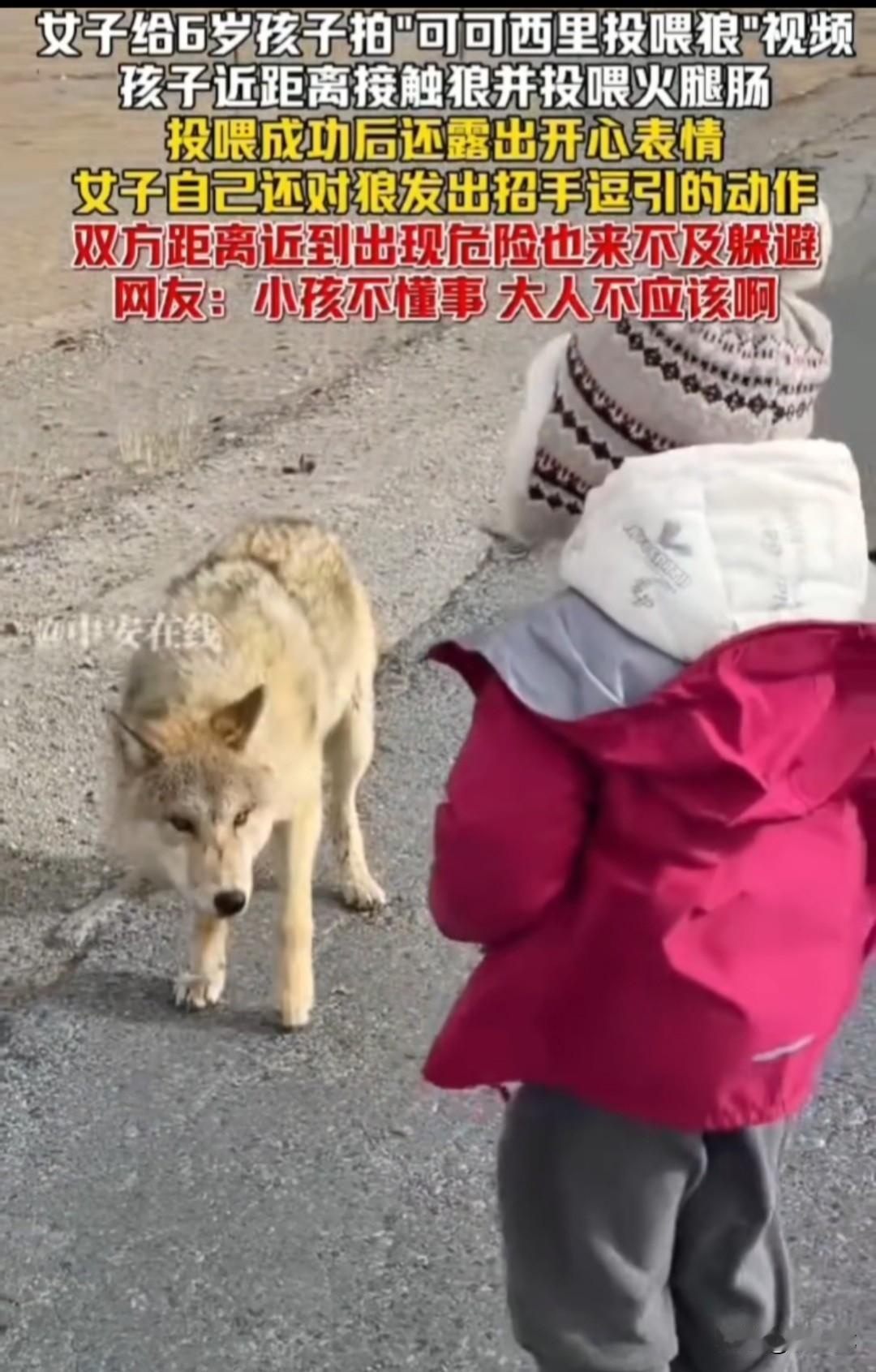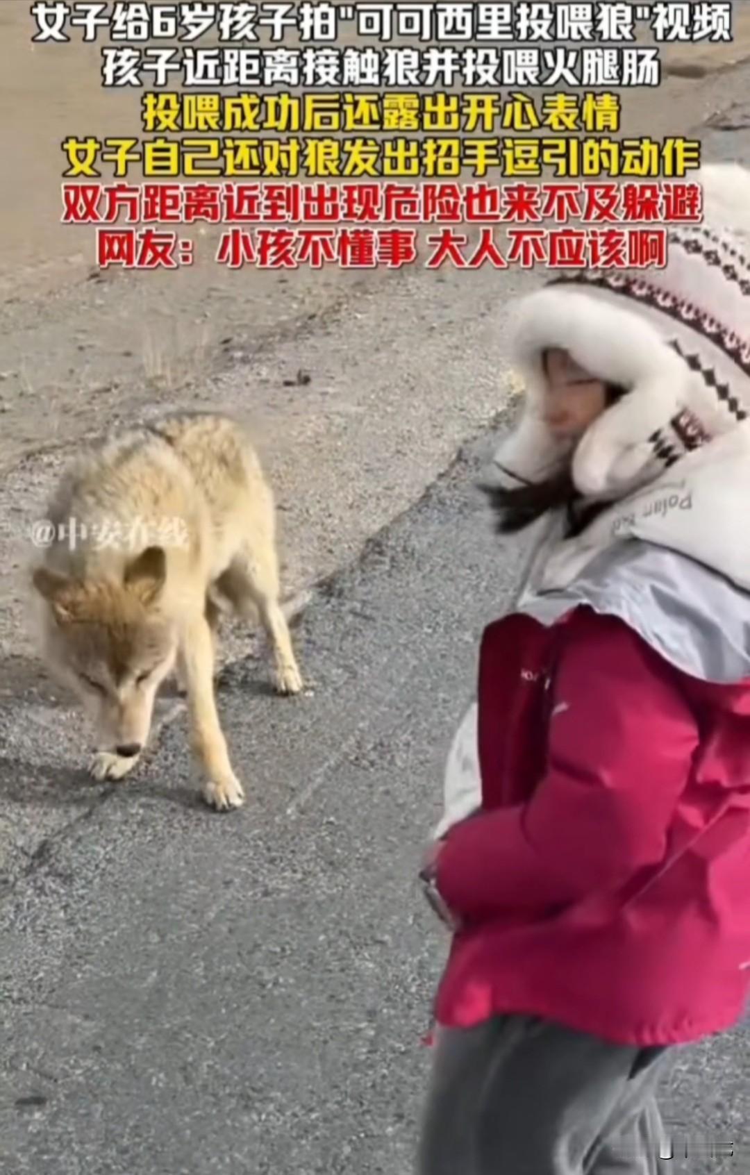 女子在可可西里遇到了一头白狼,此前女子刷视频曾见过这头狼,知道这是一头网红狼,过往游客经常会给它投喂食物,所以它不怕人,也不会伤人,反而跟人很亲近。 女子当即停车走了下来,掏出手机对着白狼拍摄,并招手引诱着白狼过来。 白狼低垂着头,畏畏缩缩地走了过来,每一步都带着迟疑。 接下来女子的做法让人瞠目结舌,她竟让自己6岁的女儿拿着火腿肠,走上前投喂白狼,自己则站在身后拍摄。 女儿有点害怕,女子鼓励她:“不要怕,它很乖,不会咬人的,就像家里的宠物狗狗。” 女儿向前走了几步,将火腿肠扔在白狼脚前,白狼迟疑着将火腿肠吃了。 看到白狼乖乖地将火腿肠吃掉,女儿回头露出了开心的笑容。 此时,一人一狼已近在咫尺。 这段视频却在网上炸锅了,网友们纷纷吐槽。 女子是厌蠢症犯了,怎么敢这样做,要知道这不是一条狗,这是一头狼,一头在野外生存的狼,你还当是自家的二哈了。 服了这种人,你自己作死就算了,还害了孩子。 出了事情,又要哭哭啼啼的去讹景区,怪景区怎么不事先提醒,这是一头狼,是不可以接近的。 其实景区对这种危险的做法早就有过警示,提醒过人们不要靠近,不要随意投喂,但有些人偏偏置若罔闻,出了事情,他们才会知道后悔。 可惜,世上就没有后悔药卖。 (素材来源:中安在线)