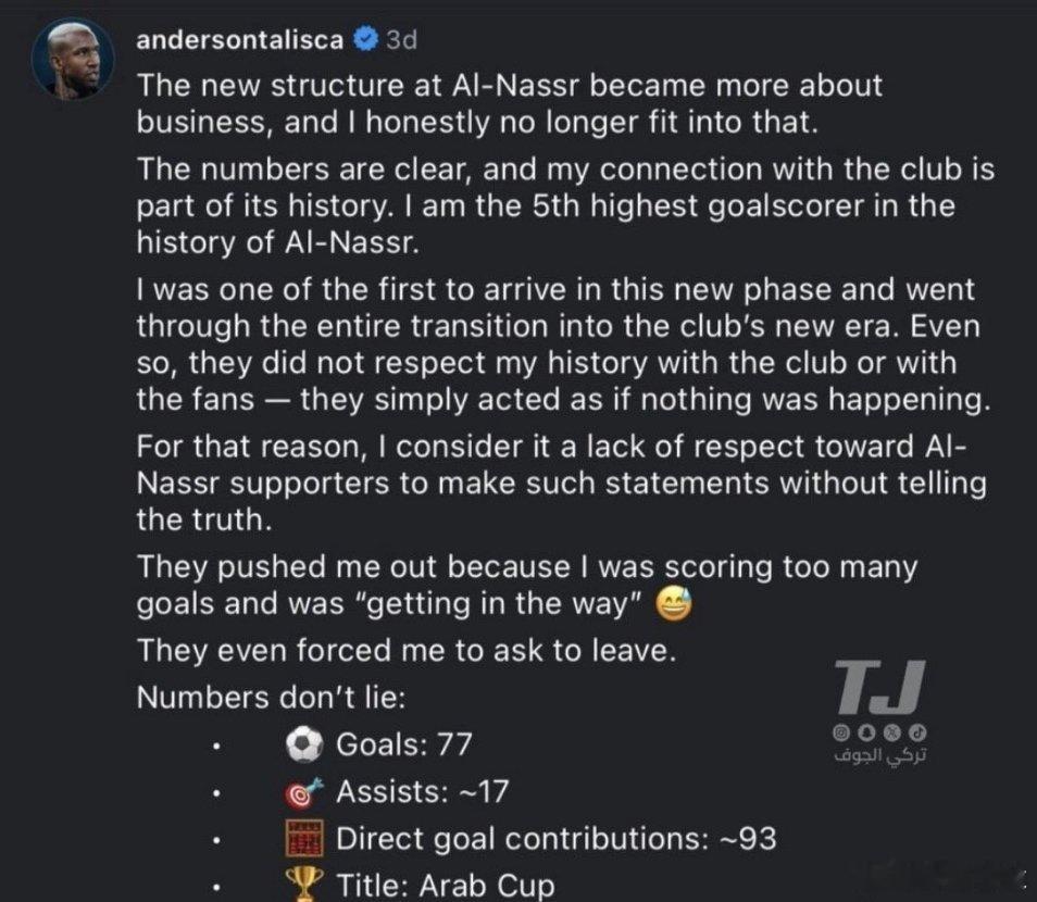 胜利俱乐部的新架构变得更注重商业。老实说,我已经不再适合那里了。数据很清楚,我是俱乐部历史的一部分。我是利雅得胜利俱乐部历史上进球数排名第五的球员。我是最早进入这个新阶段的人之一,经历了俱乐部迈向新时代的整个过渡过程。然而,他们既不尊重我与俱乐部的过往,也不尊重我和球迷的情谊。他们只是装作若无其事。出于这个原因,我认为(马吉德)发表这样的言论却不说出真相,是对胜利队球迷的不尊重。他们把我赶走了,是因为我进球太多,碍了事。他们甚至强迫我主动提出离开。数据不会说谎:我打进77球,助攻17次,直接贡献了93球(实为94个),赢得了阿拉伯杯。